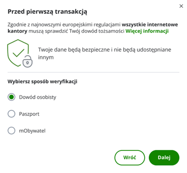 Zgodnie z przepisami prawnymi jako internetowy kantor wymiany walut jesteśmy zobowiązani do weryfikacji danych naszych użytkowników. To też wyraz troski o bezpieczeństwo Twoje i Twoich środków. Właśnie dlatego przed pierwszą transakcją prosimy, aby podać dane dokumentu tożsamości. My z kolei jesteśmy zobowiązani do ich zweryfikowania. Teraz ten proces stał się dużo łatwiejszy i szybszy – swój dokument tożsamości możesz potwierdzić w aplikacji mObywatel.