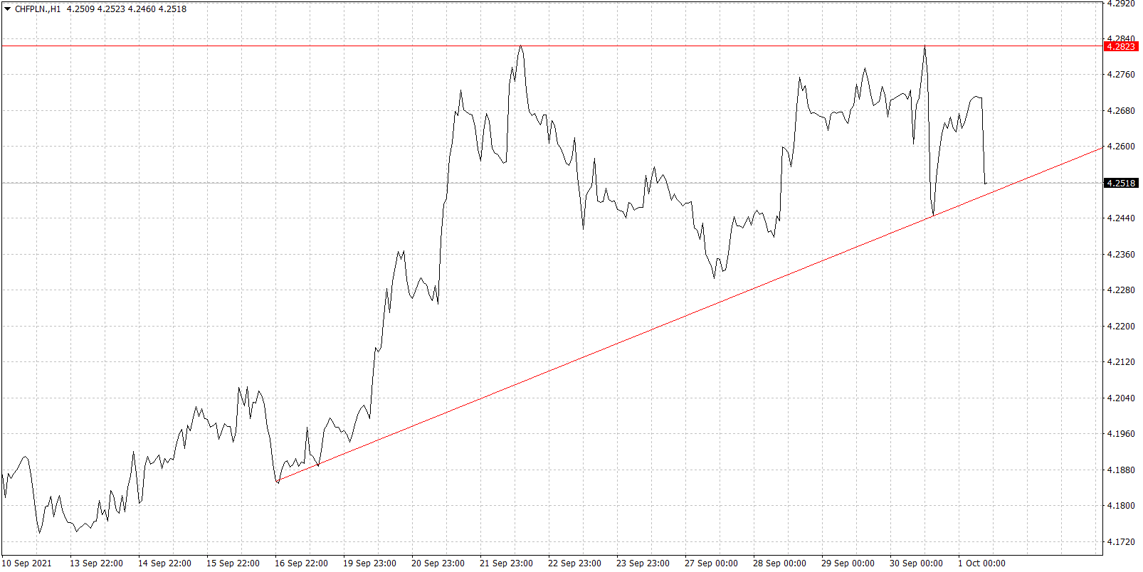 Dla kredytobiorców frankowych taka sytuacja i wyższa inflacja w Polsce to chwilowa ulga, przynajmniej pod kątem niższych płaconych rat kredytu. CHF/PLN od wczoraj spada i przynajmniej na ten moment oczekiwanie poziomu 4,30 można odłożyć na później. Teraz kurs będzie musiał się zmierzyć ze wsparciem na poziomie 4,25, które stanowi linia trendu wzrostowego. Jeśli uda się pokonać ten poziom, to niewykluczona jest kontynuacja ruchu w dół w okolice nawet 4,20. Ryzyk oczywiście na rynkach nie brakuje, na czele z IV falą pandemii, która przybiera na sile również w naszym kraju (ponad tysiąc zakażeń). Może to w przypadku dalszych pogarszających się statystyk doprowadzić do powrotu restrykcji. Jeśli chodzi o szeroki rynek, to nie warto lekceważyć problemów chińskiego giganta nieruchomości Evergrande, któremu zagraża widmo bankructwa. Powyższe dwie sytuacje mogą wpłynąć na pogorszenie nastrojów i szukanie bezpiecznych przystani przez inwestorów, a wtedy CHF może być znów mocniejszy. Oporem w przypadku wzrostów będzie ostatnie maksimum.