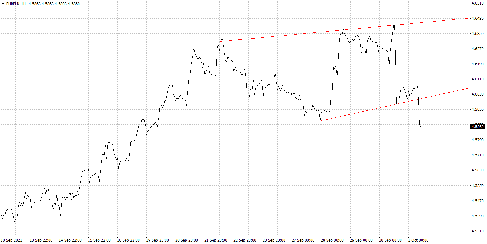 Wykres kursu euro do złotego, interwał 1-godzinowy