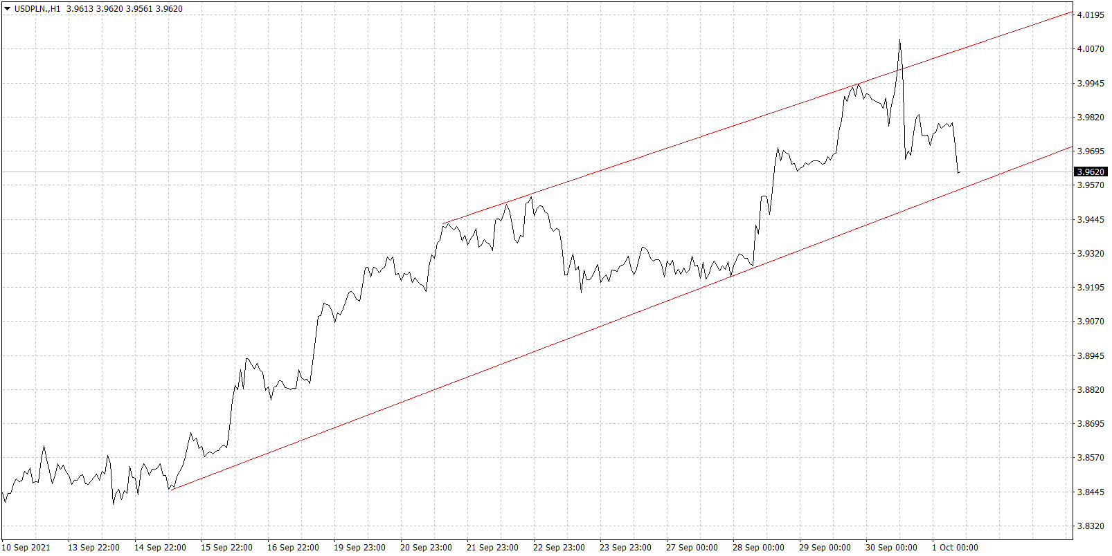 Wykres kursu dolara do złotego, interwał 1-godzinowy