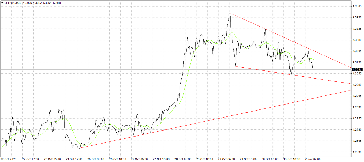 Odreagowanie widzimy również na parze CHF/PLN. Kurs testuje obecnie wsparcie na poziomie 4,30. Trzeba jednak pamiętać, że ryzyk na rynkach nie brakuje. Pomijając szalejącą drugą falę pandemii, w tym tygodniu na piedestał jednak wysuwa się bez wątpienia temat wyborów w USA. Zwycięstwo Bidena może przyczynić się do ucieczki kapitału do bezpiecznych przystani, jak właśnie frank szwajcarski. Przyczyny takich ruchów należy upatrywać w tym, że inwestorzy nie do końca wiedzą, czego można się spodziewać po nowym kandydacie i jakie będą jego pierwsze decyzje. Bez wątpienia czynnikiem ryzyka dla notowań złotego pozostaje sytuacja w naszym kraju. Fala protestów, która przechodzi przez Polskę, nie traci werwy, co może skutkować radykalnymi decyzjami naszego rządu. Od pewnego czasu mówi się też, że temat ten ma nieco przyćmić zmianę w konstytucji, dotyczącą limitu zadłużenia naszego kraju w wysokości 60% PKB. Jeśli faktycznie takie decyzje zapadną, to z pewnością zainteresują się nami agencje ratingowe i zetną nam oceny wiarygodności, co może przynieść jeszcze wyraźniejsze osłabienie złotego. W krótkim terminie więc kredytobiorcy mogą dostać chwilową ulgę, spłacając nieco niższe raty swoich kredytów, niemniej jednak w dłuższym terminie możemy być świadkami dalszego ich wzrostu z powodu osłabienia złotego w relacji do franka szwajcarskiego.