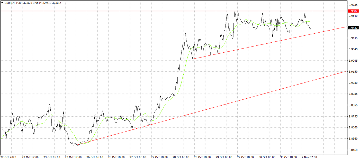 Na notowaniach USD/PLN widać chwilową stabilizację notowań, ale wydaje się to jedynie ciszą przed burzą. Konia z rzędem temu, kto by przewidział, w którą stronę może podążyć dolar amerykański po ogłoszeniu wyniku wyborów prezydenckich za oceanem. W teorii zwycięzcę już znamy, a według sondaży i firm bukmacherskich zostanie nim ze zdecydowaną większością kandydat Demokratów. Co ciekawe, według sondaży obóz Bidena ma przejąć także Senat. Rynki boją się przede wszystkim podejścia kandydata Partii Demokratycznej do sektora technologicznego. Biden jasno mówił o chęci opodatkowania wielkich korporacji i sfinansowania z tych środków całego pakietu socjalnego. Zakomunikowanie takiego podejścia po wygranej może oczywiście doprowadzić do spadków na giełdach i podkopać nastroje rynkowe. Trump owszem był mocno konfliktowy, ale jednak wielkie firmy w USA potrafił wspierać. Oczywiście biorąc pod uwagę skomplikowany system wyborczy w Stanach, nie można być niczego pewnym. Już raz kandydat Republikanów zaskoczył wszystkich i wyprzedził na ostatniej prostej kontrkandydata. Z tym że teraz poziom trudności jest większy, bo strata w sondażach jeszcze większa. Nie można też zapominać o tym, co może się stać po wyborach, a więc zakwestionowaniu jego wyniku przez Trumpa do Sądu Najwyższego. W kontekście dolara i USD/PLN więc bardzo ciekawy tydzień przed nami, gdzie posiedzenie Fed i dane z rynku pracy zejdą na boczny tor, a mówienie o poziomach wsparcia i oporu nie ma sensu.