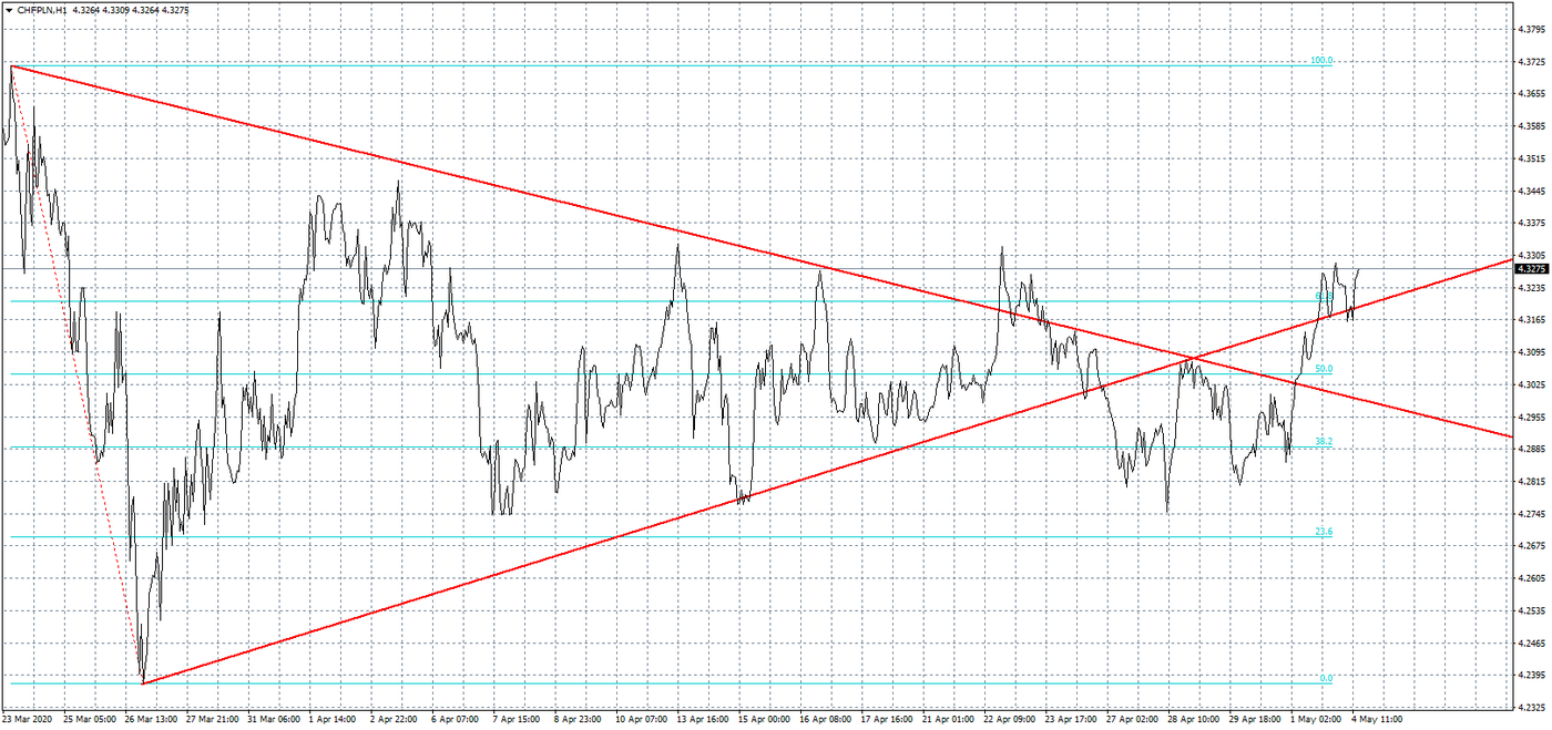 Wyłamanie się z okresu konsolidacji wyraźnie także widać na wykresie CHFPLN. Kurs franka pierwotnie opuścił formację chorągiewki dołem, po czym potwierdził ten ruch retestem zatrzymanym praktycznie idealnie w miejscu przecięcia linii trendu. Powinno to wygenerować solidny impuls do zejścia zdecydowanie niżej. Tak się jednak nie stało, co było spowodowane przede wszystkim słowami prezydenta USA. Jako że dolar nie spełnia w tym momencie za dobrze funkcji bezpiecznej przystani, tym bardziej zyskują takie waluty, jak frank, czy japoński jen. Kurs CHFPLN najpierw przełamał linię oporu w piątek, by dzisiaj powrócić powyżej linii wsparcia z wcześniej analizowanej formacji. Pewnym pocieszeniem dla frankowiczów może być, że obszar, w którym obecnie kurs się znajduje, również ma znaczenie i dopiero wybicie się powyżej 4,35 zł da kolejny impuls do ruchu w górę.