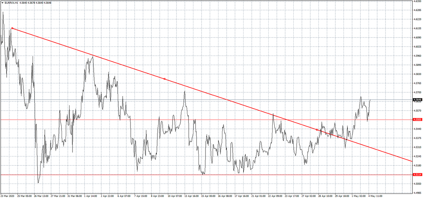 Reakcję złotego na ostatnie wydarzenia szczególnie widać na wykresie EURPLN. Kurs wspólnej waluty jeszcze na początku zeszłego tygodnia znajdował się pod presją dwóch formacji oporu. Jedną był górny zasięg konsolidacji, która próbował zarysować po opanowaniu pierwszych mocnych emocji związanych z obecnym kryzysem. Drugi to linia trendu, po której cena wspólnej waluty dobija do poziomu względnej równowagi. Obecnie oba opory zostały pokonane, a następny i to mocno naciągany znajduje się dopiero przy 4,60 zł. Jeżeli na globalnych rynkach utrzyma się sentyment ucieczki od ryzyka to niewykluczone, że jeszcze w tym tygodniu będziemy go testować. Warto pamiętać, że po pokonaniu szczytu z obecnego kryzysu następnym celem może być historyczne maksimum z 2009 roku, kiedy to euro kosztowało nawet 4,75 zł. Wszystko zależy od tego, jak trwała jest zmiana w narracji Donalda Trumpa w sprawie relacji z Pekinem.