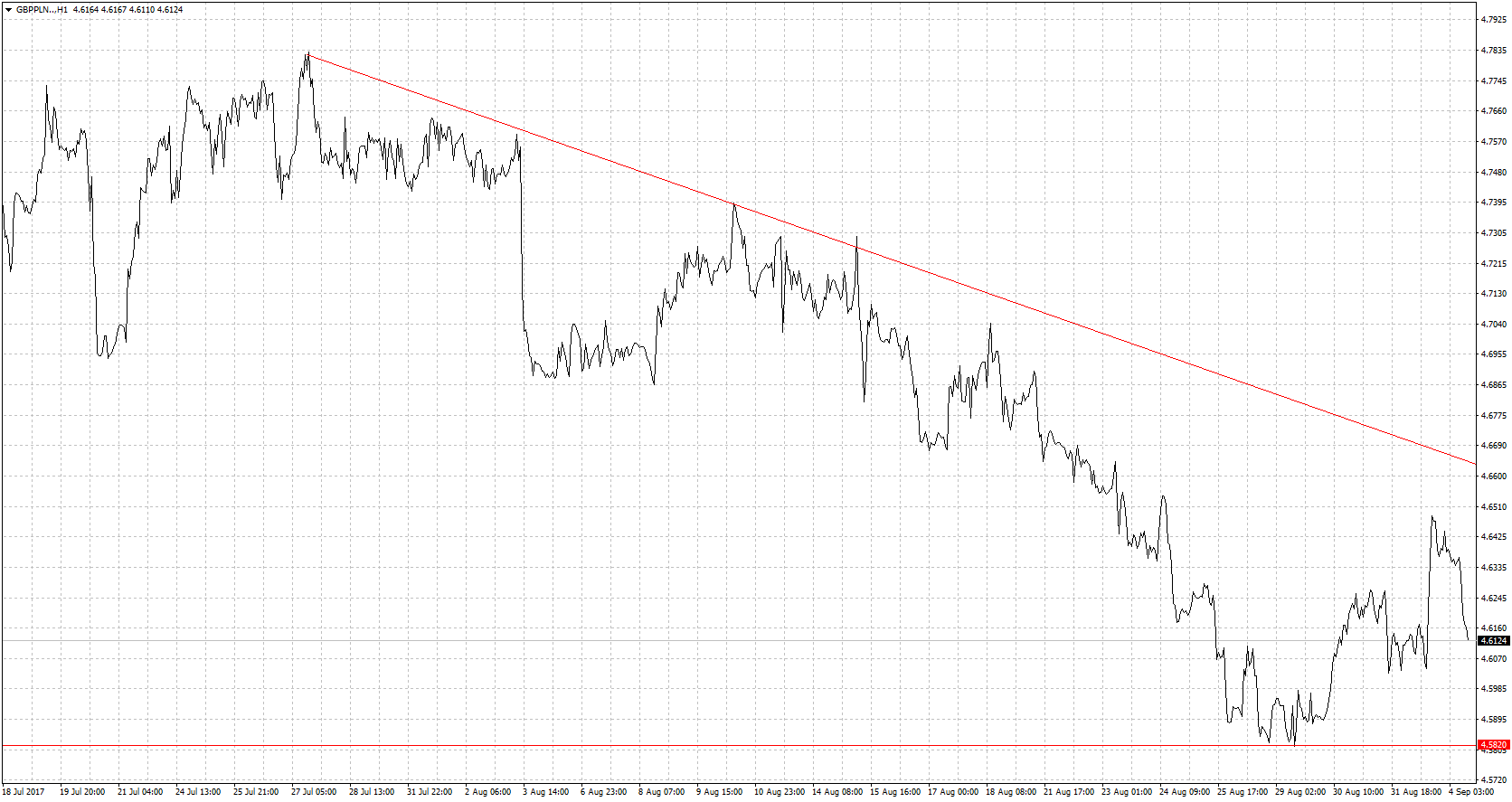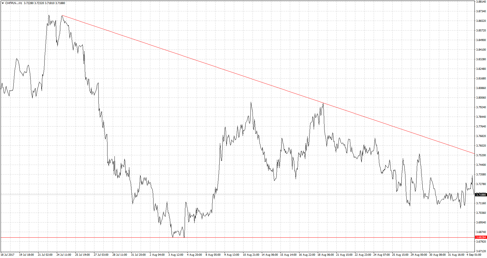 Mimo kolejnych doniesień z Azji ucieczki od kapitału z rynków wschodzących nie widać. Początkowo zyskiwały waluty uznawane za bezpieczne jak choćby frank szwajcarski czy jen ale szybko nastąpił powrót do poziomów z piątku. Po wakacjach inwestorzy bardziej będą zwracać uwagę na poważne tematy związane z polityką banków centralnych. Wydaje się więc, że kredytobiorcy frankowi mogą póki co spać spokojnie bo gwałtowny wzrosty na CHF/PLN nam nie grożą. Ale trzeba słuchać doniesień na temat Korei Północnej gdyż wybuch konfliktu zbrojnego z pewnością na dłużej popsuł by sentyment na rynkach a CHF/PLN znalazł by się kilkanaście groszy wyżej. Warto też zwrócić uwagę na posiedzenie EBC. Łagodne stanowisko Mario Draghiego może skutkować osłabieniem euro w relacji do franka szwajcarskiego. Finalnie może to osłabić nieznacznie krajową walutę w relacji do szwajcarskiej. Wsparciem będzie ostatnie minimum, w przypadku wzrostów opór stanowić będzie linia trendu spadkowego.