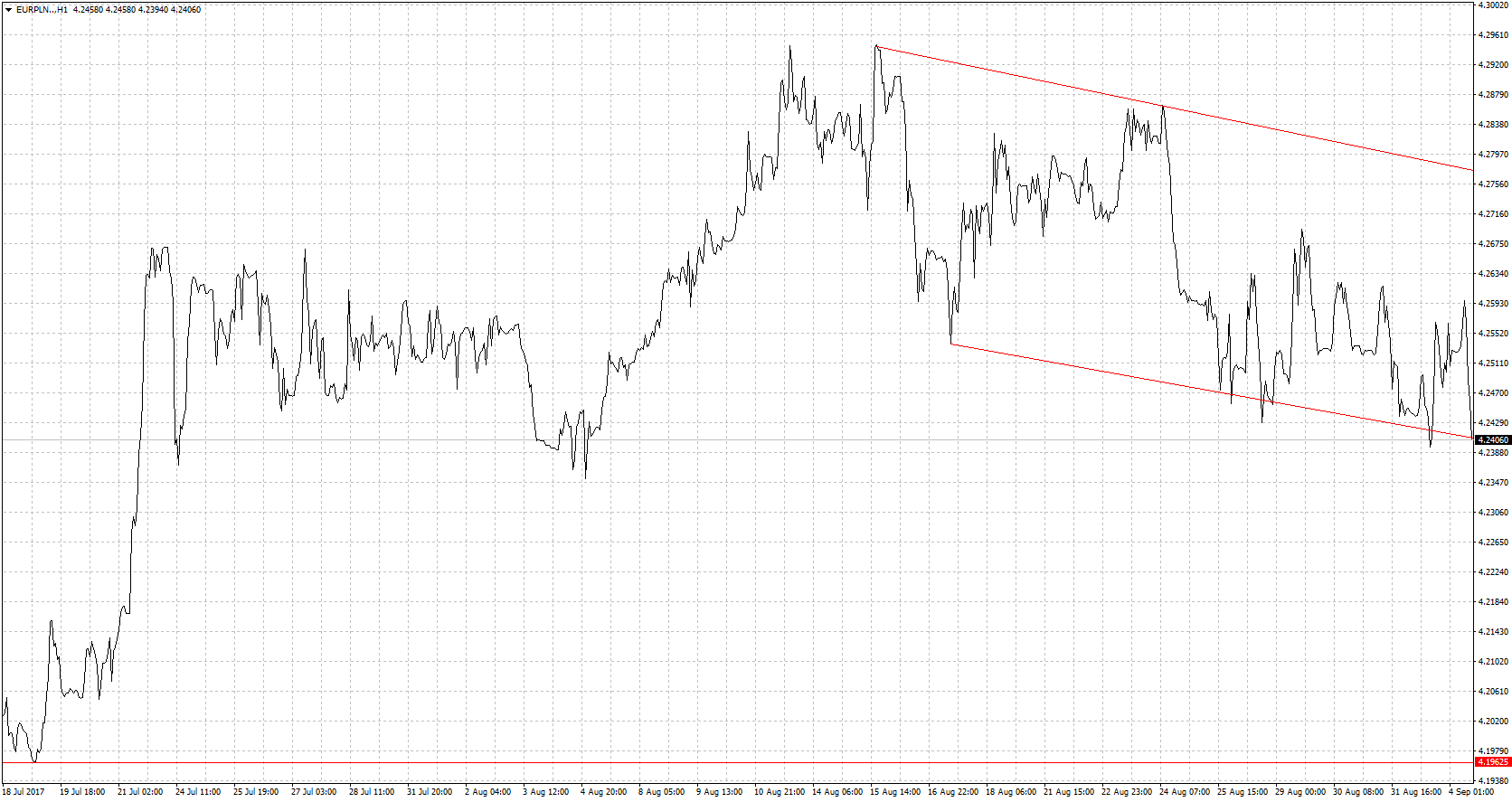 Korea Północna znów zasiała niepokój na rynkach. Reżim coraz poważniej zagraża utrzymaniu pokoju na świecie. Mimo to sentyment na rynkach pozostał całkiem dobry. Po weekendowych doniesieniach o kolejnej próbie bomby wodorowej wydawało się, że poniedziałkowy handel otworzy się ze sporymi stratami na niekorzyść walut krajów wschodzących. I przez moment tak nawet było ale bardzo szybko wrócił spokój na rynki. Inwestorzy nieco się już przyzwyczaili do prowokacji ze strony Kim Dzong Una. Wydaje się to nieco dziwne gdyż kolejne prowokacje z pewnością doprowadzą do militarnej reakcji USA. Co oczywiście wywołało by panikę na rynkach. Póki co takiej awersji na rynkach nie ma więc złoty w relacji do EUR/PLN się umacnia. Cały czas poruszając się w ramach wyrysowanego kanału spadkowego. Z pewnością krajowej walucie pomogły doniesienia agencji Moody’s, która, mocno wierzy w polską gospodarkę. Uważa, że deficyt w relacji do PKB będzie niższy od zakładanych 3%. Dzisiejszy kalendarz jest praktycznie pusty więc pozwoli to złotówce dalej kontynuować marsz w dół. Kluczowe dla kwotowań euro będzie posiedzenie EBC 7 września. Finalnie może się okazać, że polityka w strefie euro pozostanie dłużej łagodna. Co będzie oznaczało słabsze euro na szerokim rynku. Wsparciem dla ewentualnych dalszych spadków będzie dolne ograniczenie kanału spadkowego.