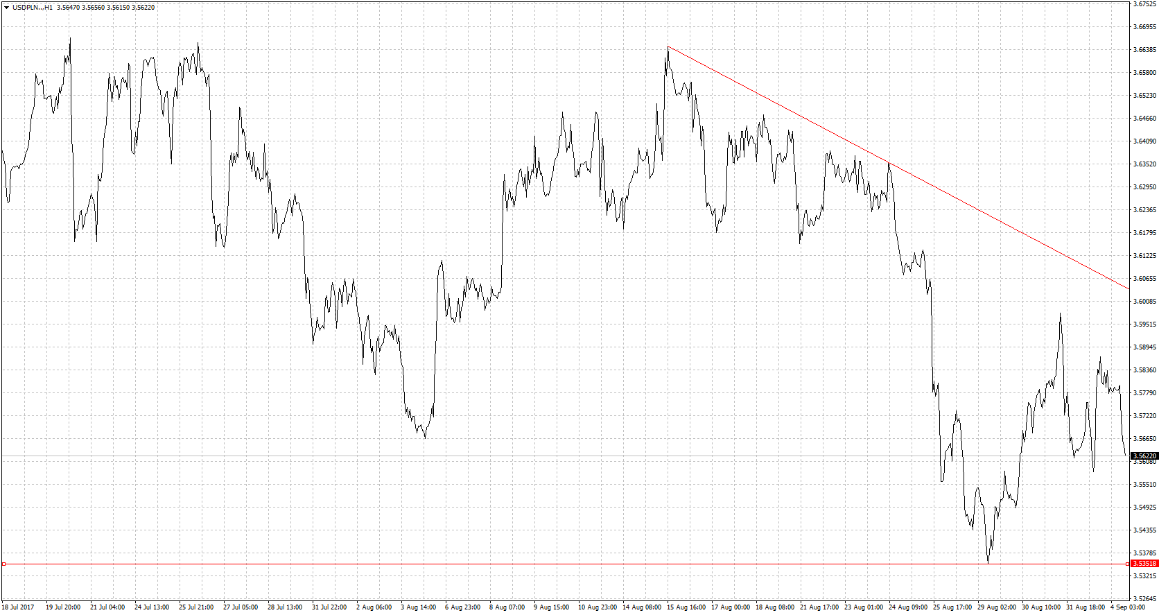 Całkiem spore ruchy na USD/PLN mieliśmy w ubiegłym tygodniu. Było to związane z niezdecydowaniem inwestorów na parze EUR/USD gdzie mieliśmy ruchy w obydwie strony. Piątkowe dane z rynku pracy z USA wypadły dość blado co spowodowało ruch w okolice 1,1950 na EUR/USD i spadek USD/PLN w okolice 3,55. Szybko jednak nastąpił zwrot sytuacji i kurs głównej pary walutowej znalazł się poniżej 1,19. Efekt był taki, że i złoty się osłabił i podążył ponad granice 3,58. Przyczyną takiego zwrotu były doniesienia agencji Bloomberg dotyczące przyszłych działań EBC i być może łagodniejszego stanowiska. Do tego otrzymaliśmy dobre dane z USA o indeksie ISM. Początek tygodnia przynosi znów zmianę sytuacji. Dolar traci na wartości. USD/PLN tym samym również powrócił do spadków wracając poniżej 3,56. Wydaje się, w obecnej chwili,że euro pozostaje bezpieczniejszą walutą niż amerykańska w obliczu możliwych działań USA w Korei Północnej. Trump może się zdecydować na zrobienie porządku z nieobliczalnym Kim Dzong Unem i to przy użyciu siły. Pokazał by tym samym, że może być skutecznym prezydentem bo wielu porażkach na krajowym podwórku. Tak naprawdę przed użyciem wojsk hamują go tylko Chiny, które sprzeciwiają się takiemu rozwiązaniu.