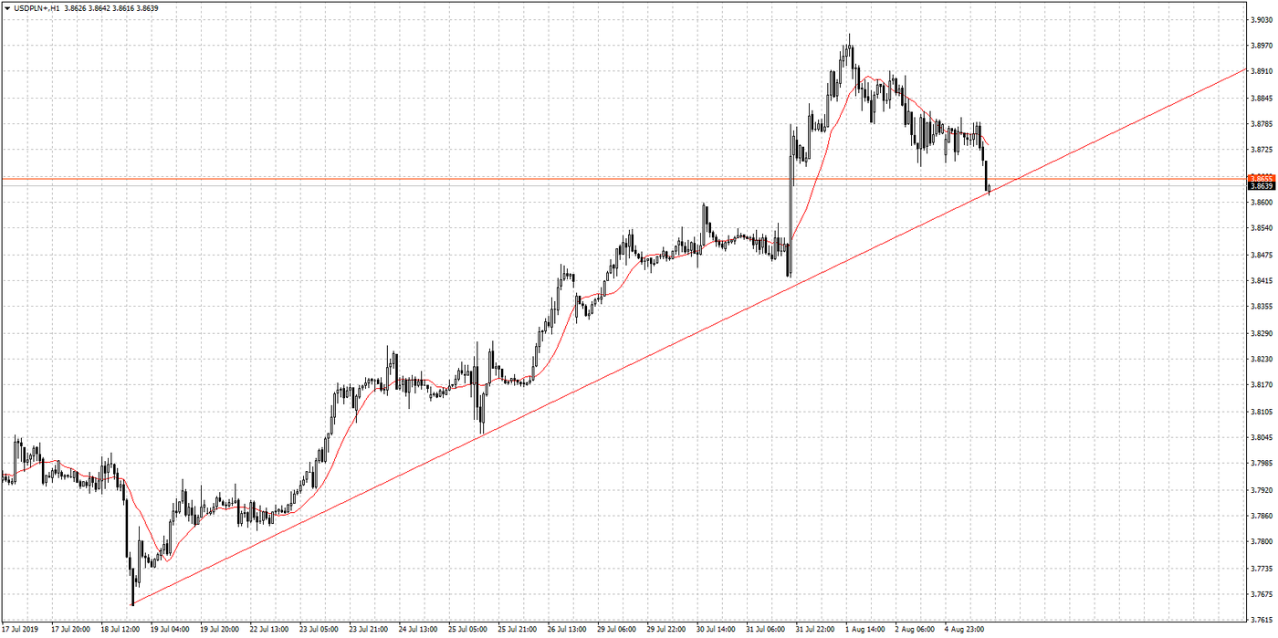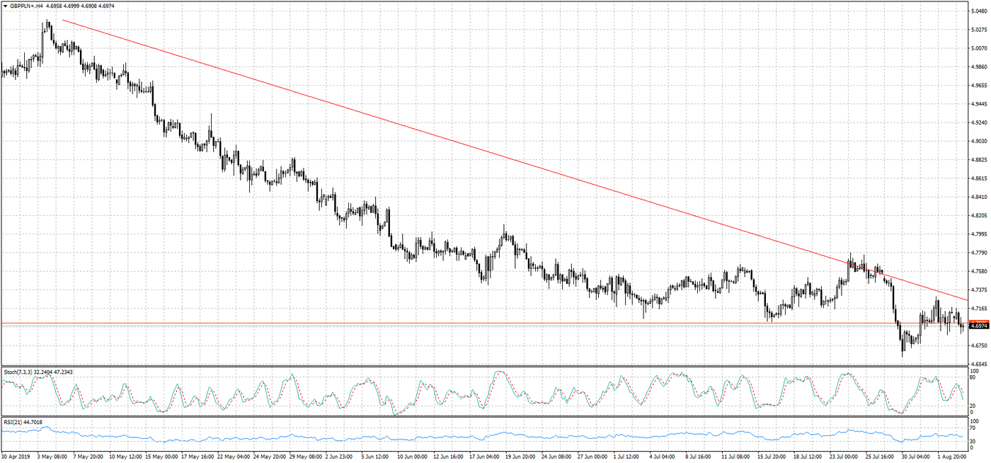 Na GBPPLN bez zmian. Funt brytyjski po chwilowym odbiciu powrócił do spadków. Aktualnie jego cena znajduje się poniżej poziomu 4,70 zł. Wszystko wskazuje na to, że nie jest to koniec spadków na tej parze walutowej. Szczególnie biorąc pod uwagę, że obecnie parlamentarzyści na Wyspach mają wolne, a po powrocie nie zostanie zbyt wiele czasu do ostatecznego opuszczenia Wielkiej Brytanii struktur UE. Do tych okoliczności dodając poglądy nowego premiera Borisa Johnsona najbardziej prawdopodobnym scenariuszem wydaje się bezumowne wyjście ze struktur wspólnoty. Czy tak na pewno się stanie? Należy jeszcze oczywiście poczekać, jednak, spoglądając na notowania brytyjskiej waluty w tym momencie, inwestorzy nie wierzą w pozytywny rozwój wydarzeń.