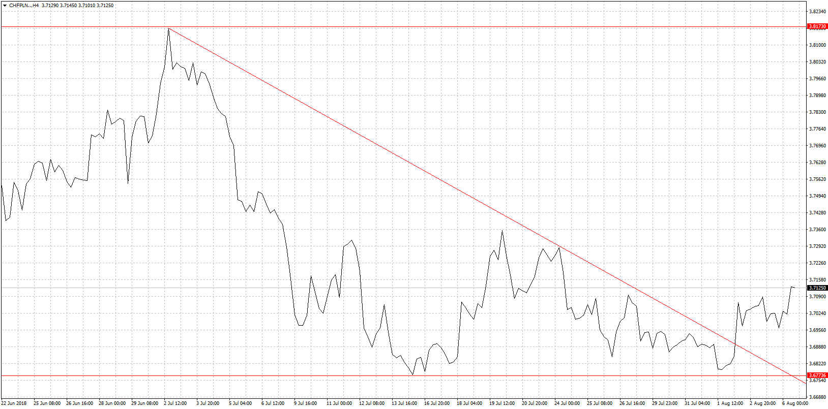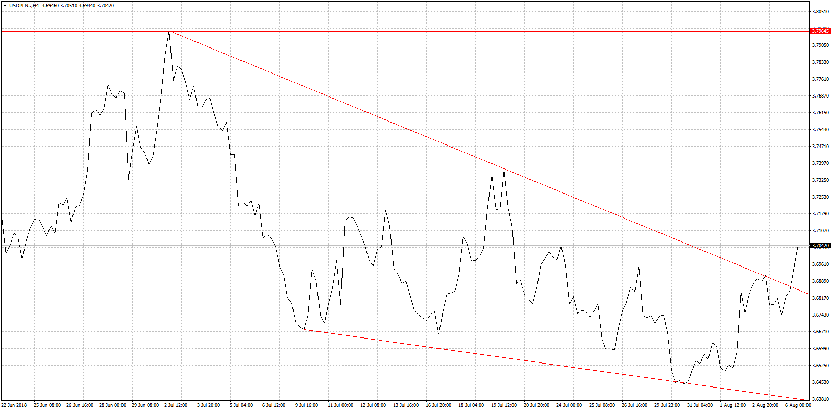 Na USD/PLN sytuacja techniczna jest dość klarowna doszło do przebicia oporu w postaci górnego ograniczenia kanału spadkowego. Wynika to bez wątpienia z faktu kontynuacji ruchu umacniającego dolara na szerokim rynku. Szczególnie po danych z rynku pracy z USA, które na pierwszy rzut oka były słabe ale jak dokładnie się przyjrzeć to już można było odnieść zupełnie inne wrażenie. Dane za dwa poprzednie miesiące zostały zrewidowane w górę a stopa bezrobocia spadła jeszcze niżej do poziomu 3,9%. Wszystkie dane bez dwóch zdań dają zielone światło amerykańskim władzom monetarnym na kontynuację cyklu zacieśniania monetarnego. Czy to koniec umocnienia dolara i czas na korektę? Absolutnie nic na to nie wskazuje Fed kontynuuje podwyżki stóp a w obliczu wojen handlowych i tym samym napięcia na rynkach waluta amerykańska jest najbardziej atrakcyjną okazją inwestycyjną. Do tego bliski poziom 1,15 na EUR/USD zawsze kusi inwestorów by go przetestować i wyczyścić choćby posiadaczy długich pozycji. Do tego euro ma swoje problemy stąd trudno o odreagowanie na jego korzyść. A szczególnie szanse dolara na dalsze wzrosty będę jeszcze większe jeśli Trump utrzyma swój buńczuczny ton i zacznie sypać dalszymi pomysłami nakładania ceł na Chiny. Scenariusz mocnego dolara oczywiście nie jest korzystny dla złotego i straci on także w innych głównych relacjach. USD/PLN w tym momencie testuje poziom 3,70 ale wydaje się, że to nie jest koniec tego ruchu w górę.