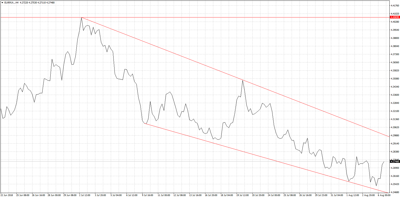 Początek tygodnia przynosi kontynuację scenariusza z końca ubiegłego tygodnia. Umacnia się więc dolar, a znacznie traci euro. Jeśli chodzi o EUR/PLN to drastycznych wzrostów nie widać, choć sytuacja nieco się pogorszyła, a złoty stracił kilka groszy. Nie jest to raczej odreagowanie techniczne, wynikające z ostatniej dość sporej fali umocnienia z rejonów 4,40 na 4,25. Sytuacja krajowej waluty kształtuje się w głównej mierze na bazie aktualnych sentymentów na rynkach światowych. A te znów nie są dobre. Mamy kolejny akt wojny handlowej. Tym razem Trump szczyci się swoimi sukcesami w tej kwestii. I widzi swoją znaczną przewagę nad Chinami. Najgorsze jest to, że oba kraje nie widzą ujemnych skutków tych zatargów. PMI pokazują pogarszanie się koniunktury gospodarczej niewidziane od 10 lat. I ten fakt coraz bardziej dociera do inwestorów, w efekcie wyprzedają oni aktywa krajów wschodzących. Stąd bardzo realny jest powrót EUR/PLN znów powyżej 4,30 i tym samym złamanie oporu w postaci górnego ograniczenia kanału.
