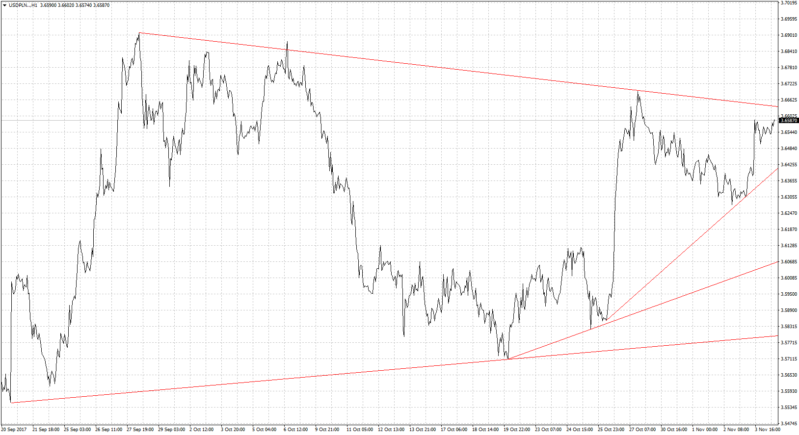 CHF/PLN obecnie testuje linię trendu spadkowego. Pod koniec października już taka sytuacja miała miejsce ale wtedy próba ta zakończyła się fiaskiem a kurs podążył w kierunku lokalnego minimum. Póki co na rynkach nie widać wiele ryzyk, więc inwestorzy niechętnie uciekają do tematu do walut uznawanych za bezpieczne jak frank szwajcarski. Stąd jakieś nagły wzrost kursu CHF/PLN nam nie grozi. Trzeba jednak pamiętać o kwestii Korei Północnej, która została nieco zapomniana przez rynki. A moment na pokazanie swojej obecności na świecie Kim Dzon Un ma idealny. Z wizytą w Azji przebywa Donald Trump. I z pewnością na szeregu planowanych konferencjach o tej kwestii wspomni. Może to oczywiście przełożyć się na powrót do gry słów na linii USA-Korea Północna. W przypadku sforsowania linii trendu spadkowego kolejnym oporem będzie 3,70. Wsparciem pozostanie ostatnie minimum.