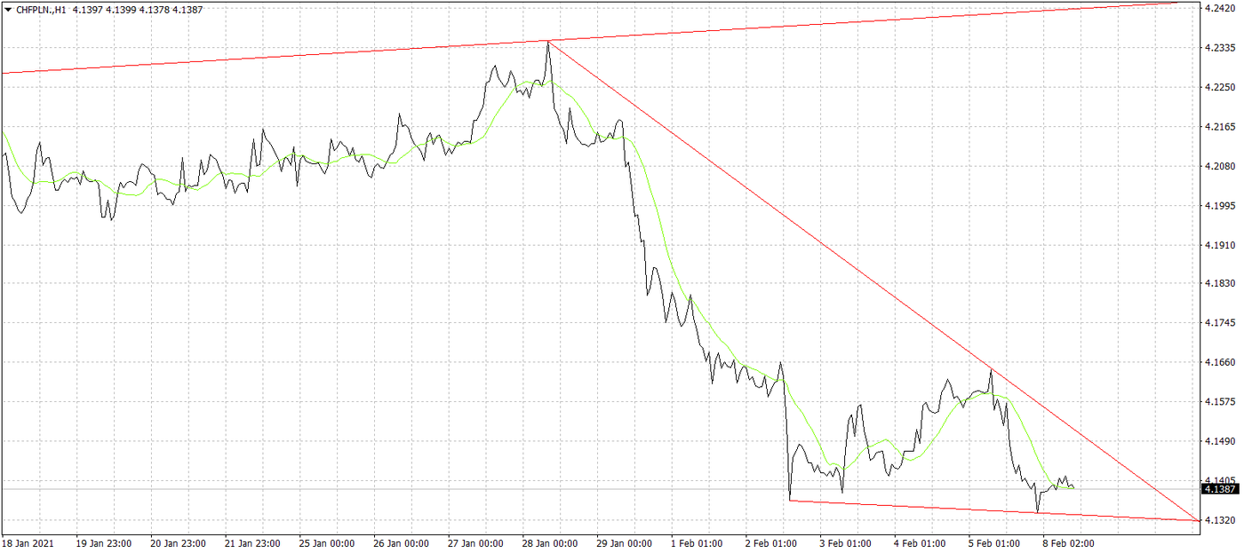 Wykres kursu franka do złotego, interwał 1-godzinowy