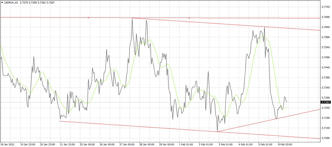 USD/PLN ma za sobą spory spadek notowań z okolic 3,76 do obecnie 3,72. Winne słabości dolara okazały się dane makro, a konkretniej raport z sytuacji na rynku pracy. Rewizja zatrudnienia za ostatnie dwa miesiące wyniosła prawie 200 tys. miejsc pracy i to w dół. W styczniu zatrudnienie było niższe, patrząc r/r o blisko 10 mln osób. Statystyki pokazały też, że jedynie 57,5% obywateli USA w wieku roboczym pracuje. W takim tempie odbudowy miejsc pracy pełnego zatrudnienia nie uda się odbudować już w przyszłym roku, jak to przewiduje nowa sekretarz skarbu Janet Yellen. Patrząc z innej perspektywy słabe dane to jasny sygnał dla władz monetarnych i politycznych, że o odpuszczaniu stymulacji fiskalnej nie ma mowy. To też sygnał dla kupujących dolara, że komunikacja Fed o szybszej normalizacji polityki monetarnej i zmniejszanie QE po prostu w najbliższym czasie nie będzie mieć miejsca. Stąd nie dziwi odwrót od “zielonego” po wspomnianej publikacji danych w piątek. Patrząc od strony technicznej korekta na EUR/USD zakończyła się równo na 400 pipsach jak rok wcześniej, co może być sygnałem zmiany trendu na wzrostowy. Jeśli taki scenariusz się ziści to USD/PLN powinien kontynuować ruch na południe, a pierwszym przystankiem może być poziom 3,70.