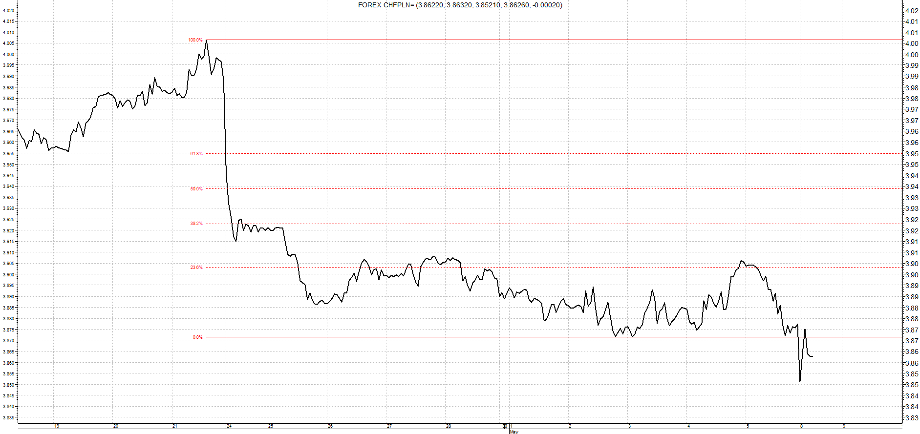 Kredytobiorcy frankowi zacierają ręce. Ich raty kredytowe już dawno nie były tak niskie jak teraz. Przypomnijmy po czarnym czwartku kurs CHF/PLN momentami oscylował wokół 5,00. Później po uspokojeniu sytuacji kurs rewidował w okolicach 4,00-4,25 rzadko spadając poniżej tej dolnej granicy. Teraz jesteśmy prawie 15 groszy poniżej tej granicy. Czy to koniec marszu w dół? Niekoniecznie granica 3,80 jest w zasięgu. Polska gospodarka wyraźnie spisuje się powyżej oczekiwań, co może w dłuższej perspektywie nawet skutkować zwiększeniem wiarygodności przez agencja ratingowe. Do tego frank szwajcarski jest słaby na szerokim rynku bo brakuje jakichkolwiek zagrożeń a więc inwestorzy nie muszą póki co szukać bezpiecznych przystani. Dodatkowo zwycięstwo Macrona we Francji odsunęło ryzyko rozpadu strefy euro. Teraz rynkom chwilę czasu zajmie zanim znów znajdą sobie nowe tematy na tapetę. I ten czas powinien działać na korzyść polskiej waluty. Mimo tak sporej dawki pozytywów warto jednak zawsze zachować umiarkowaną ostrożność. W końcu gdzieś z tyłu głowy mamy takie tematy jak wcześniejsze wybory we Francji czy nierozwiązany konflikt w Korei Północnej. Póki co jednak wszyscy o tym zapomnieli.