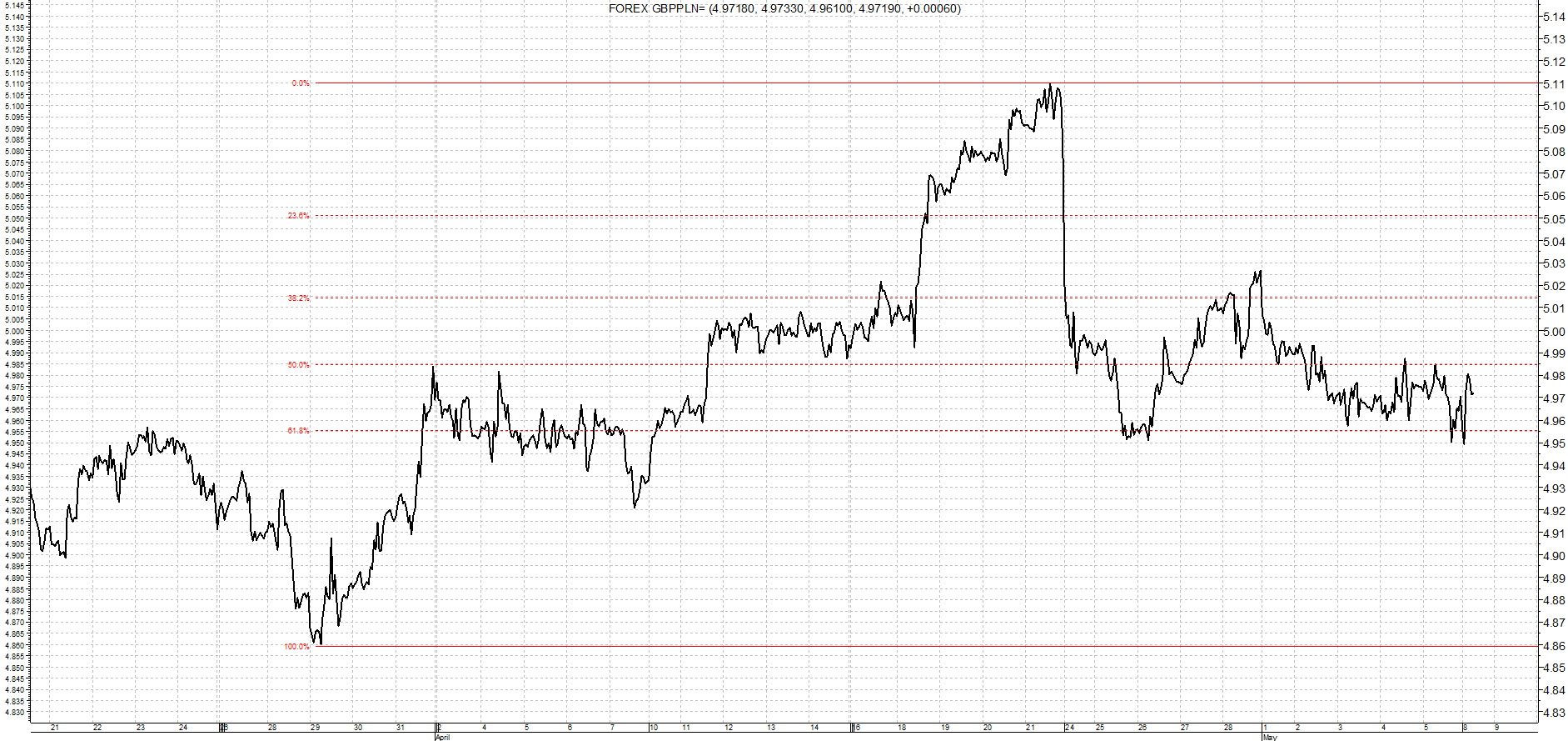 Sytuacja na GBP/PLN nieco się uspokoiła. Wybory we Francji spowodowały, że całe zamieszanie z Brexitem nieco przycichło. Ale teraz gdy wynik już jest rozstrzygnięty na tapetę wróci temat wcześniejszych wyborów w Wielkiej Brytanii. Do tego postawa Unii Europejskiej wydaje się być nieugięta i brytyjczycy dostaną solidną fakturę do zapłaty za swoją wizję niezależnego państwa. Na wykresie aktualnie testujemy wsparcie w postaci 61,8% zniesienia Fibonacciego. Przebicie tego poziomu może spowodować ruch nawet w okolice ostatniego minimum w okolicach 4,86. Dodatkowo ruchowi w dół powinien sprzyjać dobry klimat wokół krajowej waluty.