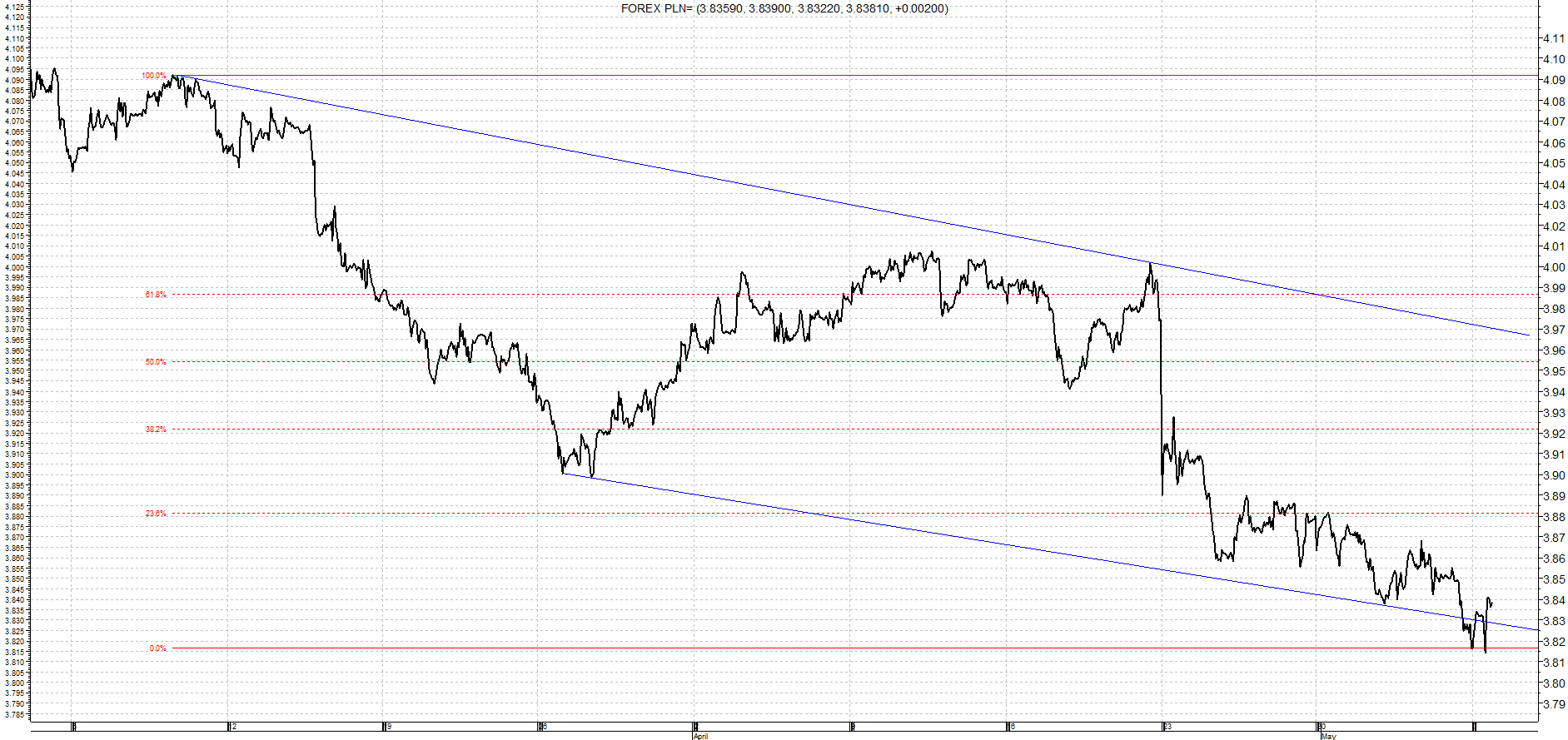 Jeszcze bliżej złamania granicy 3,80 jest USD/PLN. Ale może się okazać, że wcale nie musi ta granica zostać przebita. Główna para walutowa świata po ogłoszeniu wyniku wyborów we Francji tylko na chwilę przebiła granice 1,10 by po chwili już być w okolicach 1,0930. Teraz uwaga może się skupić na przyszłych działaniach Fed i oczekiwanej przez rynki podwyżki stóp w USA już w czerwcu. Twarde dane makro nie dają jasnej odpowiedzi czy taki ruch jest już przesądzony Owszem stopa bezrobocia jest rekordowo niska ale już tempo wzrostu wynagrodzeń niekoniecznie. Ale jeżeli prawdopodobieństwo czerwcowego ruchu będzie rosło to inwestorzy wrócą do kupowania amerykańskiej waluty, która dość sporo ostatnio straciła. Całkiem możliwy więc jest ruch powrotny do wyrysowanego kanału spadkowego. Obecnie testowane jest wsparcie w postaci dolnego ograniczenia tego kanału. Silny opór w przypadku wzrostów stanowić będzie górne ograniczenie kanału w okolicach 3,97.