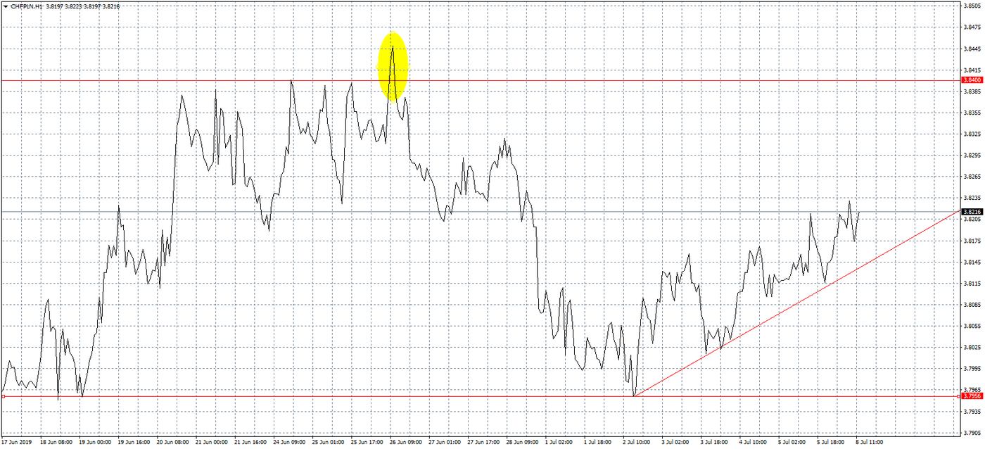 Frank już od dłuższego czasu mocno zakotwiczył na poziomach powyżej 3,80 zł. Po tym, jak na początku lipca nieśmiało testował to wsparcie, obserwujemy większą aktywność strony popytowej. Obecnie zmierzamy w kierunku 3,85 zł, który to poziom w ostatnich miesiącach był już wielokrotnie atakowany. Wzrost napięcia na Bliskim Wschodzie może jednak okazać się niewystarczający, aby trwale pokonać ten opór. Z zaskakującą pomocą przyszedł w ten weekend prezydent Turcji Recep Erdoğan, który poprzez dymisję szefa tamtejszego banku centralnego pogrzebał nadzieje na stabilizację liry. Teraz możemy oczekiwać, że turecka waluta ponownie będzie ciążyć wszystkim pozostałym z koszyka rynków wschodzących, wspierając tym samym bezpieczniejsze aktywa, do których zaliczany jest frank szwajcarski. Obecnie ciężko wyrokować, czy to wystarczy, by nakreślić nowe szczyty, lecz należy stwierdzić, że przynajmniej próba takich ruchów jest bardzo prawdopodobna.