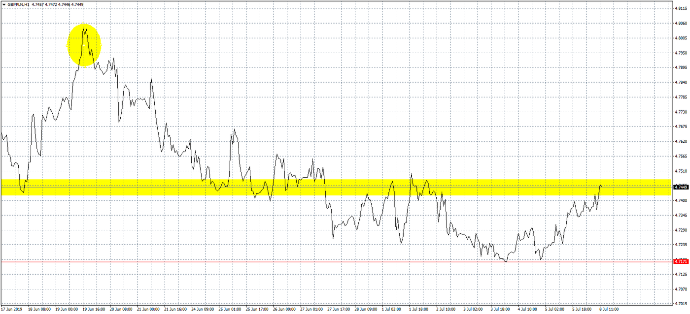 Wykres kursu funta do złotego, interwał 1-godzinowy