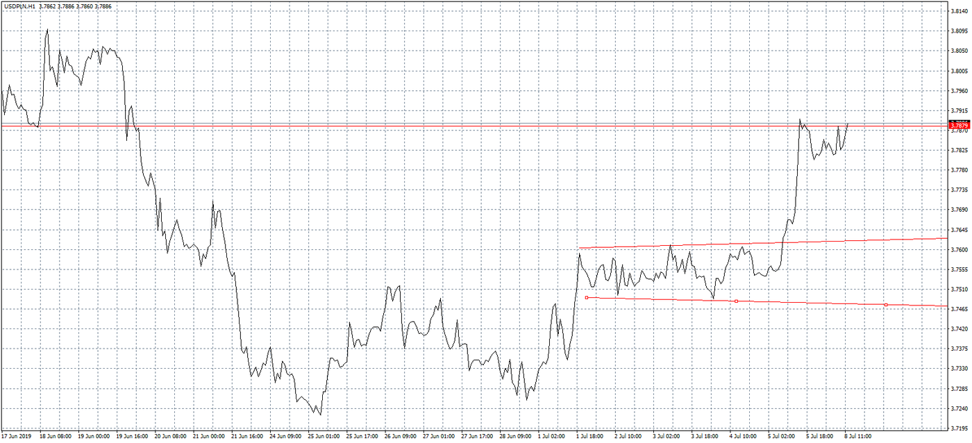 Wykres kursu dolara do złotego, interwał 1-godzinowy