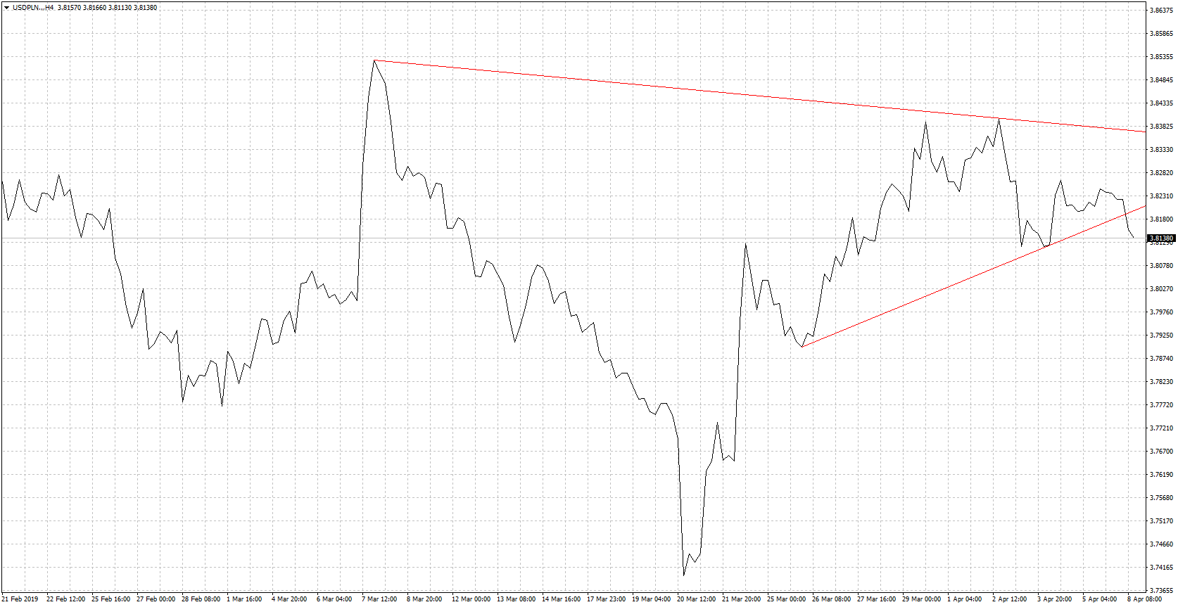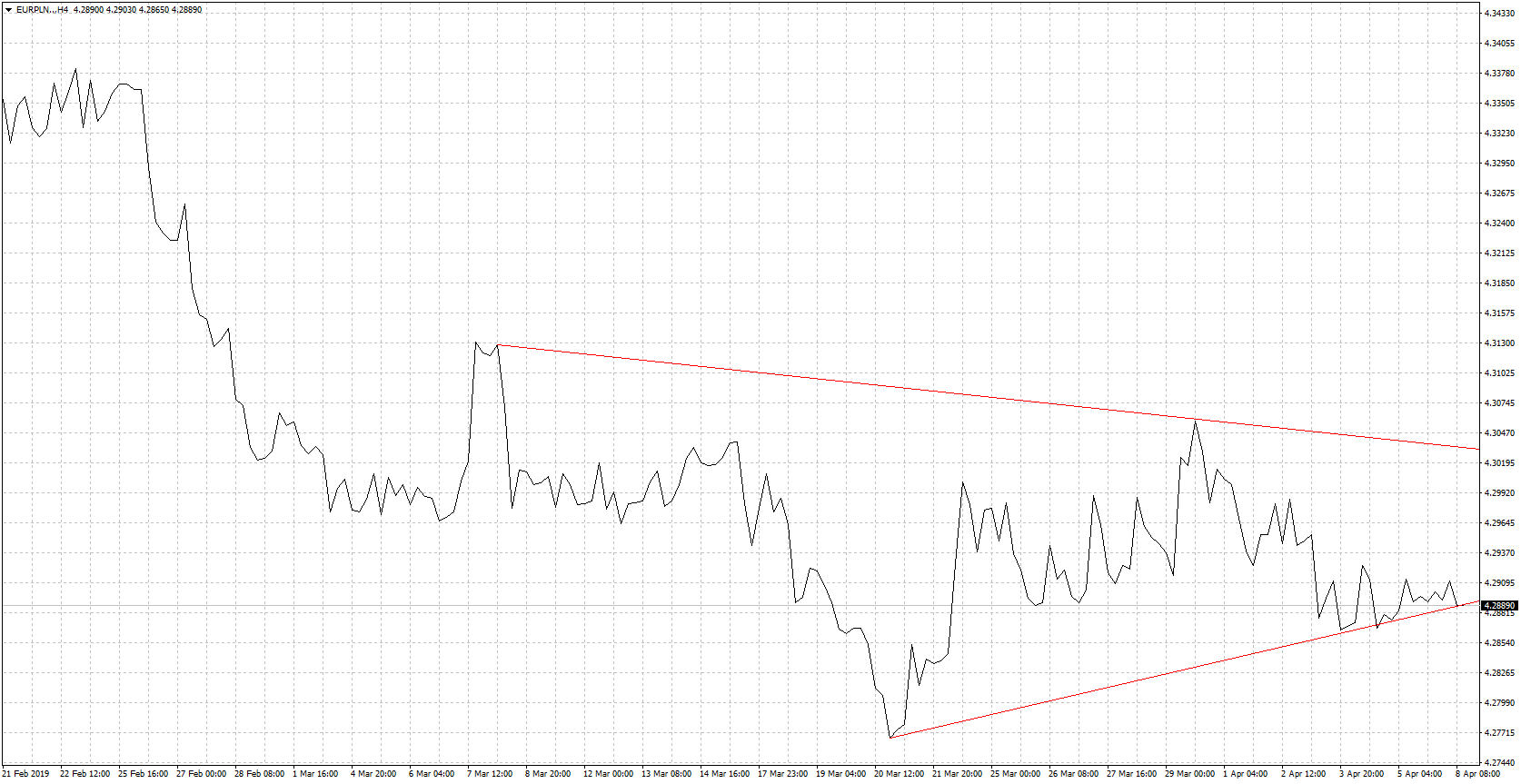 Poprzedni tydzień stał pod znakiem bardzo dobrych nastrojów na rynkach. Pozwoliło to EUR/PLN zejść nieco poniżej granicy 4,30 ale też trzeba zauważyć, że ruch był naprawdę minimalny. Fakt w ostatnim czasie ruchy na tej parze nie grzeszą zmiennością i brakuje silniejszych wahań. Wracając do nastrojów to czy rzeczywiście jest tak dobrze, że nie ma się czego martwić? Absolutnie nie. Kolejne dane z niemieckiej gospodarki wyglądają po prostu źle. Największy spadek notują zamówienia do przemysłu, które w przyszłości przełożą się zapewne na spadek produkcji. Cały czas pozostaje pytanie czy to tylko chwilowe problemy i zapaść gospodarcza czy jednak dłuższy trend. Bez wątpienia w przejściowość tego stanu wierzy EBC, którego to w tym tygodniu odbędzie się posiedzenie. Obecnie władze monetarne strefy euro koncentrują się na poprawieniu płynności banków komercyjnych i tym samym poprawienia akcji kredytowej. Wydaje się jednak, że kwestią czasu będzie pojawienie się spekulacji o wznowieniu programu skupu aktywów. Oczywiście nawet pogłoski w tym temacie przełożą się na osłabienie wartości wspólnej waluty. Pamiętać jednak trzeba, że technicznie uruchomienie QE jest niemożliwe w związku z obowiązującymi limitami. Co nie znaczy, że nie można uruchomić podobnych narzędzi i ominąć obostrzenia. Często wraz z utratą wartości przez euro traci i polski złoty. Póki co trwa walka na lokalnym wsparciu w postaci dolnego ograniczenia kanału. Sforsowanie tego poziomu powinno skutkować spadkiem o kilka groszy może nawet w okolice 4,25 pod warunkiem utrzymania się dobrego sentymentu na rynkach i pozytywnych doniesień z frontu walki o jak najlepsze relacje w handlu a więc USA z Chinami.