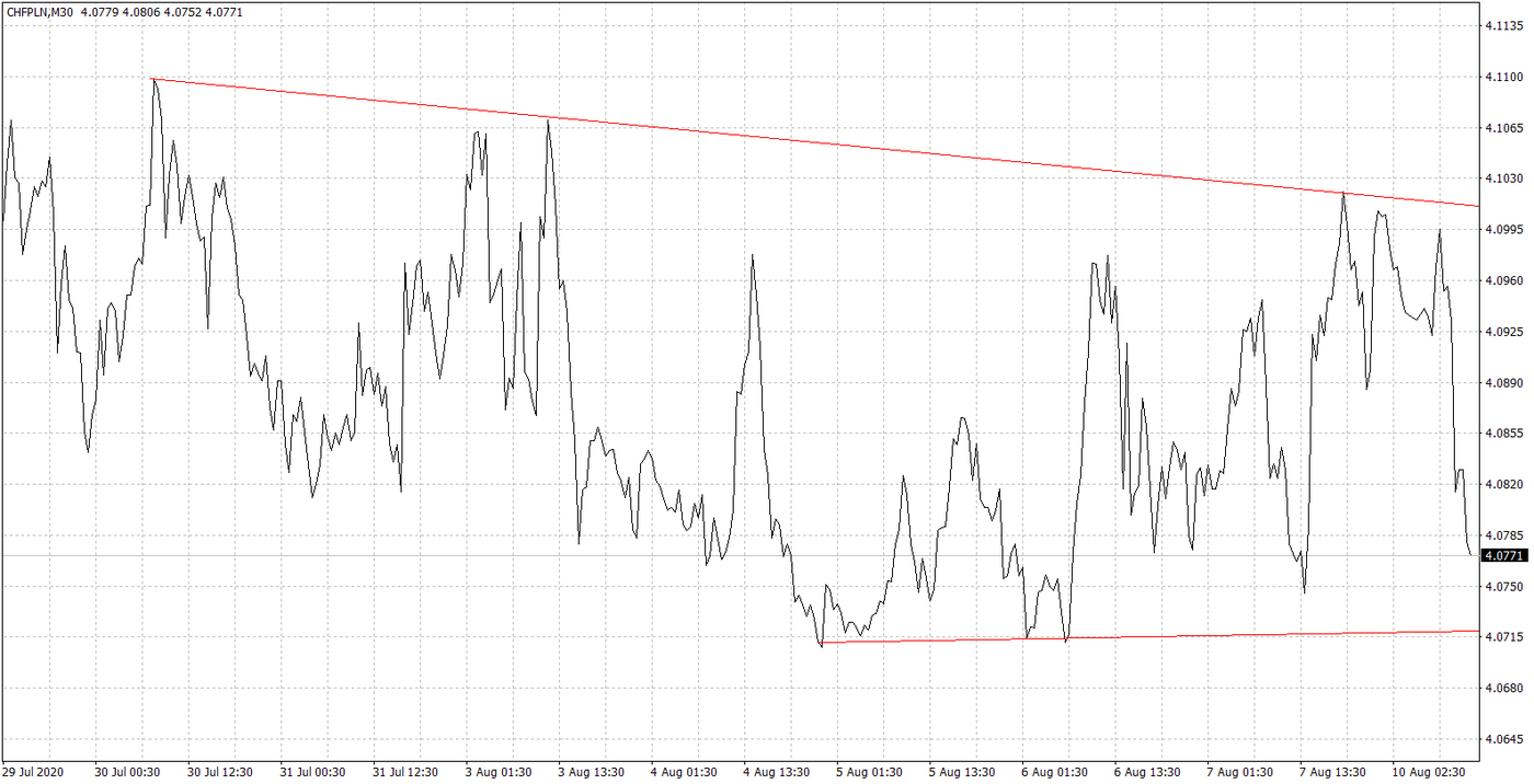 Zaskakująco bez wpływu na złotego (póki co) jest sytuacja na Białorusi, gdzie po wyborach robi się gorąco. Na ten moment na niepokojący rozwój spraw w tym regionie nie reagują Rosjanie. Niewykluczone jednak, że reakcja nastąpi nieco później, tak jak to miało miejsce na Ukrainie. Rynki póki co ignorują możliwy scenariusz kolejnej aneksji byłych terytorium przez Rosję. Jeśli nie pojawi się wojsko na ulicach w Mińsku to krajowa waluta w relacji do franka może dalej kontynuować ruch na południe w kierunku ostatniego minimum. W przypadku jednak eskalacji konfliktu w tej części Europy tuż za naszą granicą to o trendzie spadkowym na CHF/PLN szybko zapomnimy. Bez wątpienia nie można zapominać o kwestii relacji USA i Chin, które znów są na ostrzu noża po tym jak Trump zakazał działalności chińskich aplikacji jak TikTok, czy WeChat. Póki co chiński rząd nie zareagował, ale jeśli w akcji odwetowej zobaczymy np. zakaz używania urządzeń Apple, to z pewnością szybko nastroje na rynkach się popsują.