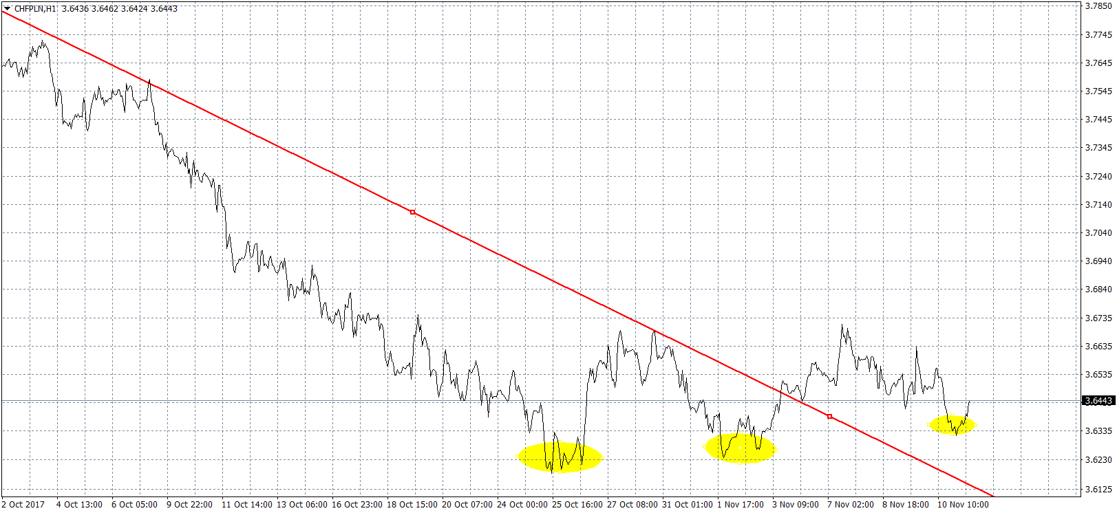 Frank szwajcarski w końcu zdołał przełamać linię trendu spadkowego. Prawdopodobnie oznacza to przynajmniej chwilowe odejście od dalszej przeceny helweckiej waluty. Za tym scenariuszem przemawia fakt, że kolejne trzy dołki ukształtowały się na coraz wyższych poziomach. Oczywiście nie oznacza to od razu odwrócenia trendu, jednak ustabilizowanie ceny franka wokół poziomu 3,65 zł jest jak najbardziej możliwe. Potencjalny ruch w górę na wykresie CHFPLN jest ograniczany przez opór w okolicach 3,673 zł, co oznacza, że potencjał do wzrostów jest mocno ograniczony. Frank jest obecnie najtańszy od pamiętnego 15 stycznia 2015 roku, co zapewne cieszy szerokie grono “Frankowiczów”.