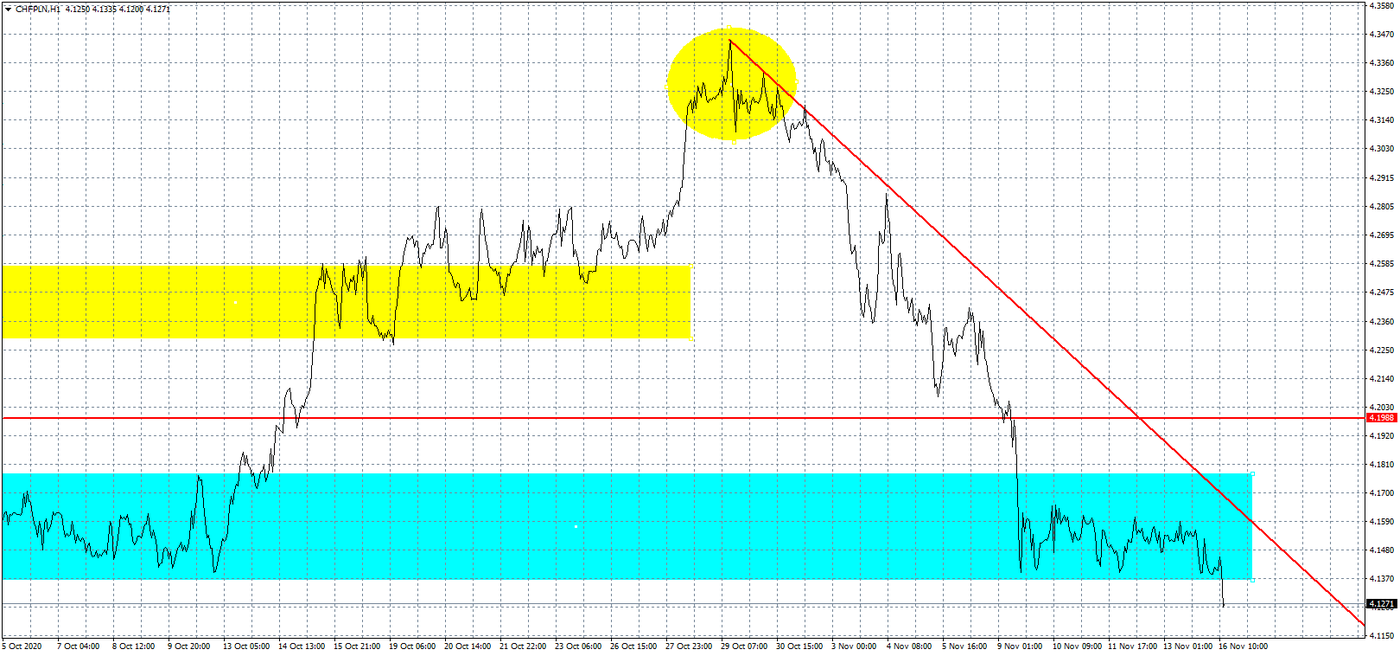Frank szwajcarski również wymazał cały zeszłomiesięczny ruch, wracając do punktu wyjścia. Poszedł nawet krok dalej i właśnie podejmuje próbę zejścia jeszcze niżej. Po tym, jak na koniec października kurs CHF/PLN dotarł do poziomu 4,34 zł, rozpoczął rajd w dół, który z czasem nabierał coraz większej dynamiki. Ostatecznie kurs dotarł do poziomu 4,14 zł, gdzie przynajmniej na chwilę udało się zatrzymać spadki. Poniedziałek przynosi jednak próbę wyłamania tego wsparcia, jeśli nie zostanie ono zanegowane w najbliższych godzinach, otworzy się droga, by przetestować nawet poziom 4,05 zł. Dużo zależy od tego jak długo uda się utrzymać globalny sentyment risk on, a dzisiejsze doniesienia o szczepionce Moderny sugerują, że może to jeszcze trochę potrwać.