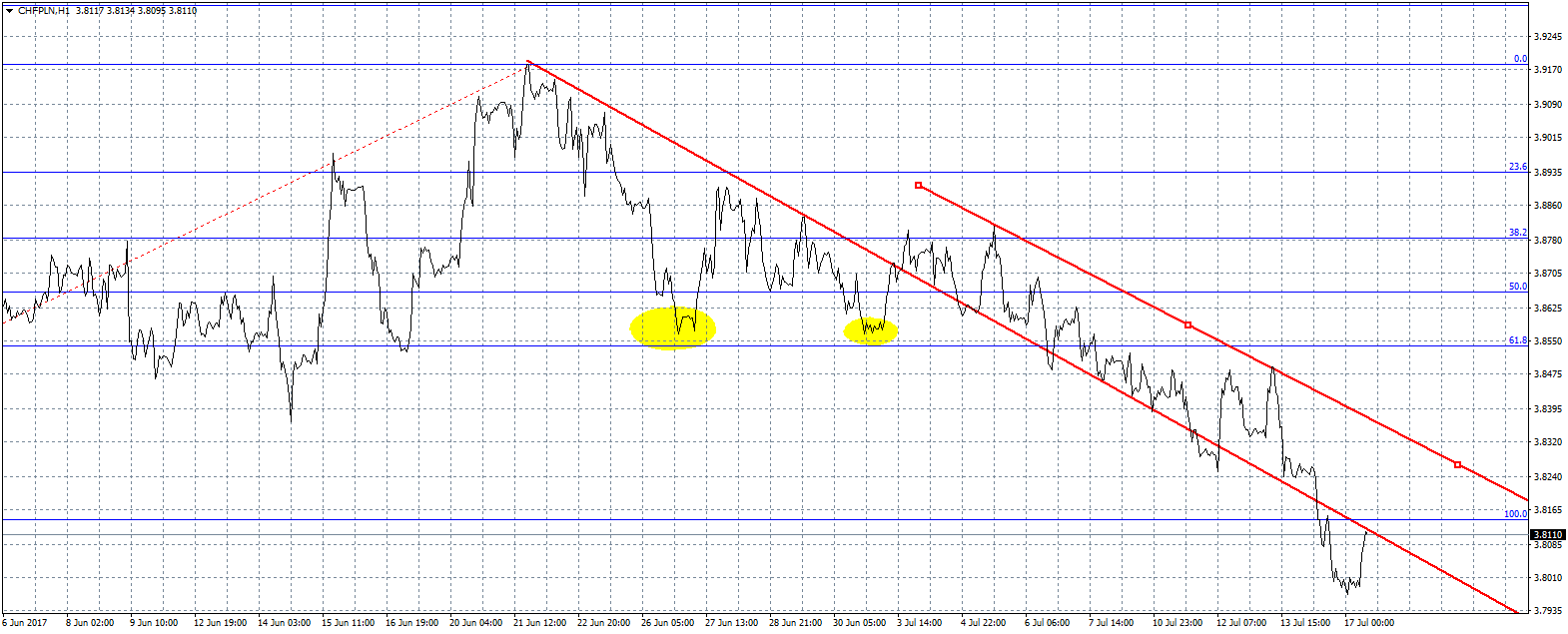 W coraz lepszych humorach są zapewne polscy “frankowicze”, którzy w ostatnim czasie mogą obserwować taniejącego franka. Jeszcze dwa tygodnie temu mogło się wydawać, że właśnie kształtuje się formacja podwójnego dna, która teoretycznie powinna odwrócić trend. Później jednak kurs CHFPLN znalazł się w silnym spadkowym kanale, przez co udało się sforsować ważne wsparcie na poziomie 3,855 zł. W ostatnich dniach trend jeszcze bardziej przyspieszył, przez co wyłamał od dołu wyżej opisany kanał. Obecnie testuje jego dolne ograniczenie, jednak nawet w przypadku powodzenia, nie będzie to oznaczało końca ruchu spadkowego. Prawdopodobnie jeszcze w tym tygodniu uda się zaznaczyć kolejne minimum.