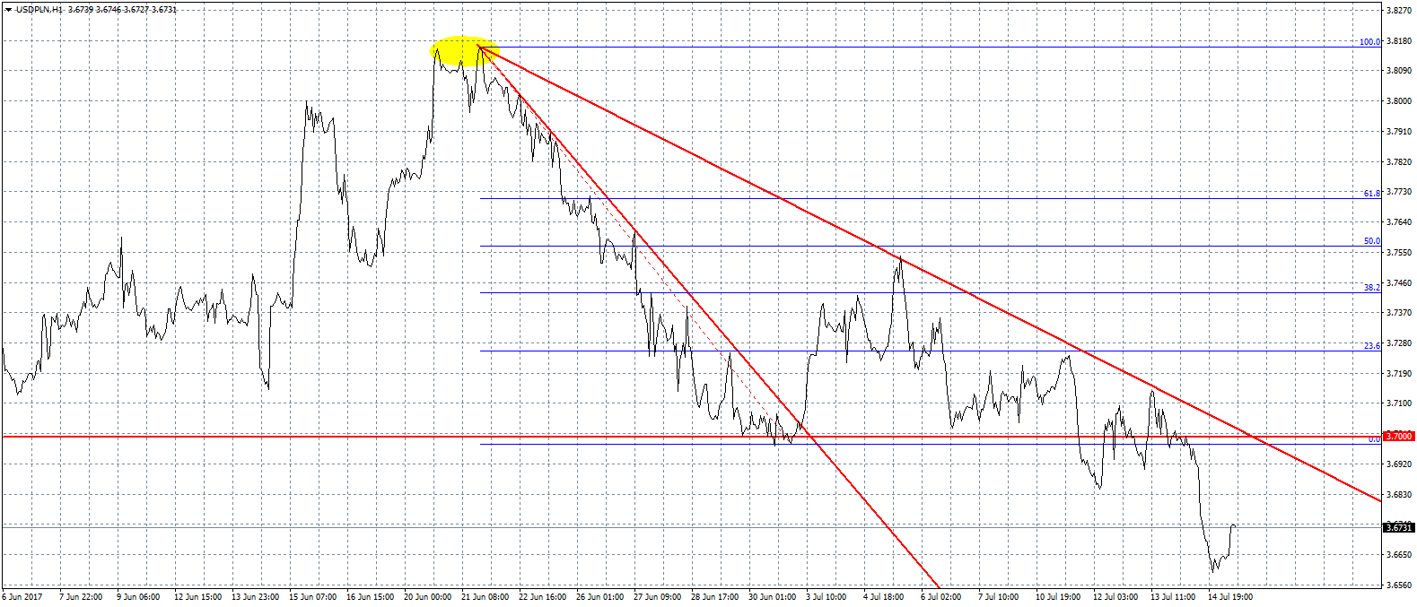 Dolar ostatnio przełamał linie silnego trendu spadkowego. Jego umocnienie jednak nie trwało długo, choć korekta w tym czasie zniosła prawie 50% ruchu spadkowego. Ostatecznie jednak kurs USDPLN znowu znajduje się w trendzie spadkowym, który może nie jest już tak dynamiczny, jednak cały czas pozostaje silny. Świadczyć o tym może chociażby fakt przebicia bardzo ważnego poziomu 3,70 zł. Obecnie dolar kosztuje 3,67 zł i wiele wskazuje, że to nie jest jeszcze koniec przeceny amerykańskiej waluty. Ostatni raz tak tani dolar był w drugiej połowie 2015 roku, kiedy lokalne minimum wyniosło 3,625. Jest możliwe, że będziemy testować ten poziom jeszcze w obecnym tygodniu. Fed cały czas ma problem z inflacją, która niespodziewanie zaczęła hamować. Inwestorzy coraz mniej wierzą w zapewnienia prezes Yellen, że ten spadek jest chwilowy i spowodowany jednorazowymi czynniki. Fedowi na pewno nie pomógł zeszłotygodniowy odczyt, który również okazał się niższy od założeń. Przed dolarem ważny okres, ponieważ coraz więcej osób wątpi w wyznaczoną ścieżkę podnoszenie stóp procentowych.
