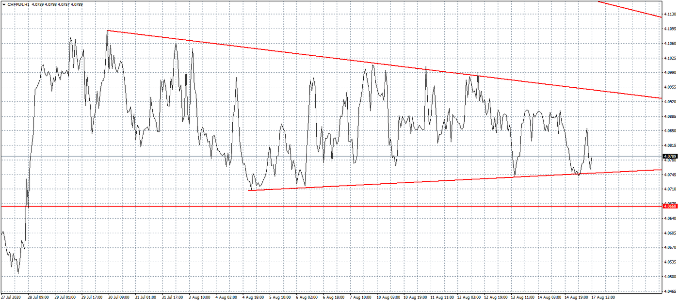 Prawdziwym liderem w festiwalu sierpniowej nudy na rynkach pozostaje jednak frank szwajcarski. Tu nie dosyć, że od miesiąca mamy do czynienia z konsolidacją, to ta konsekwentnie zmniejsza swój zakres z biegiem sierpniowych dni. Obecnie doszliśmy do zasięgu na absurdalnym poziomie dwóch groszy. Co więcej, do zamknięcia obecnej formacji trójkąta, jeszcze daleka droga, co oznacza, że taki stan rzeczy może potrwać nawet do końca miesiąca. Kurs CHF/PLN wykazał się zaskakująco odporny na fatalne odczyty dynamiki PKB, które wieściły największe recesje zarówno w Szwajcarii, jak i w Polsce. Flauta na rynku spowodowała, że zanikły również standardowe przepływy między bezpiecznymi przystaniami, a bardziej ryzykownymi aktywami. Obecny tydzień ma raczej niewielkie szanse zmienić ten stan rzeczy, więc na rozhuśtanie rynku zapewne przyjdzie nam poczekać, być może nawet i do września.