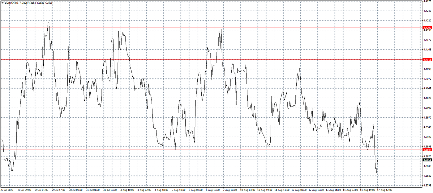 Na pierwszy rzut oka wykres EUR/PLN nie wygląda wcale tak źle. Jest na nim kilka ciekawych zagrań, trzy wyraźne linie oporu, zejścia oraz testowania, wszystko co analiza techniczna lubi najbardziej. Rzecz w tym, że ta cała akcja toczy się na zaledwie czterech groszach. Dyferencjał poniżej 1% w skali miesiąca pokazuje z jak wielką posuchą mamy do czynienia. Poniedziałkowa sesja przynosi atak na lokalne minimum przy 4,385 zł. Poziom ten nawet chwilowo udało się naruszyć, przez co wspólna waluta była najtańsza od początku czerwca. A warto pamiętać, że w międzyczasie kurs nieśmiało zahaczył nawet o pułap 4,50 zł. Euro ostatnio radzi sobie całkiem nieźle na szerokim rynku, wychodząc między innymi na głównej parze walutowej świata na nowe tegoroczne szczyty. Pokazuje to też, jak mocny jest nasz złoty i to mimo starań rodzimego banku centralnego, który ostatnio wprost zasugerował, że walczy o osłabienie naszej waluty. Na szczęście RPP z tym celem radzi sobie równie kiepsko, jak z trzymaniem inflacji w ryzach.