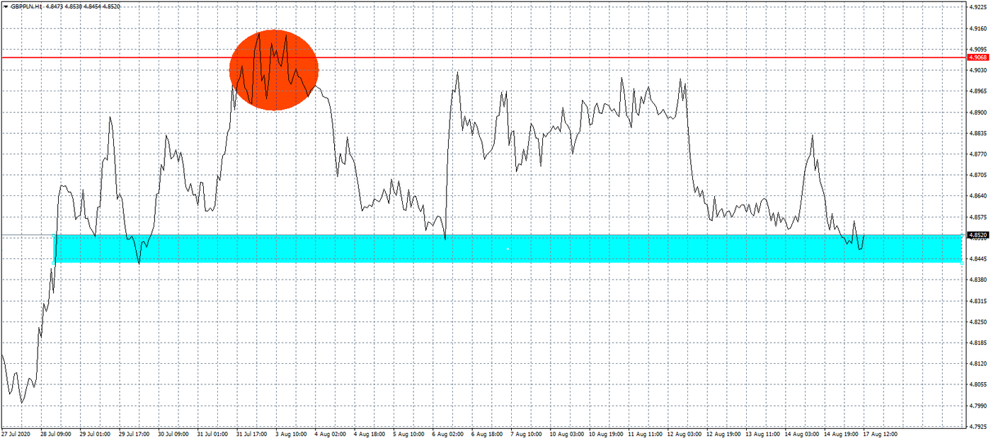 Względny spokój panuje także na parze GBP/PLN. Od początku miesiąca obserwujemy 6-groszową konsolidację i choć zdarzają się większe ruchy, to są one przeważnie wynikiem tylko i wyłącznie dotarcia do granicy obszaru, w którym kurs się porusza. Wielka Brytania cały czas pozostaje w czołówce krajów najbardziej dotkniętych przez Covid. Już teraz jest mowa o największej recesji w historii (a akurat Wielka Brytania ma bogatą historię kryzysów gospodarczych), a wiele wskazuje na to, że jeszcze daleko do opanowania sytuacji. Funt pod koniec lipca wygenerował ponad 10 groszowy rajd w górę, jednak później wraz z kolejnymi wzrostami zachorowań coraz bardziej tracił impet. Teraz znacznie bardziej prawdopodobne wydaje się wyłamanie konsolidacji dołem niż górą. Zreszta poniedziałkowa sesja przynosi kolejną już próbę realizacji tego scenariusza.