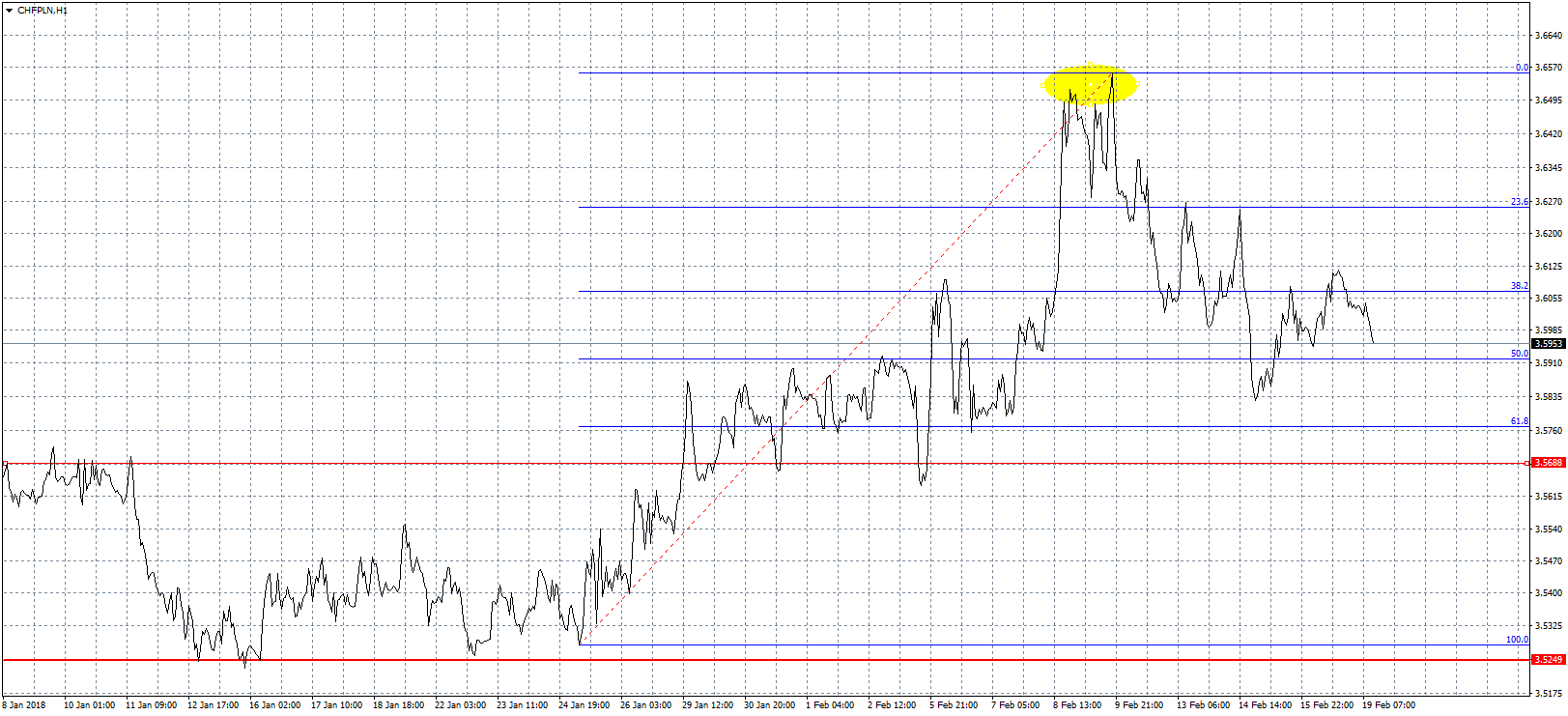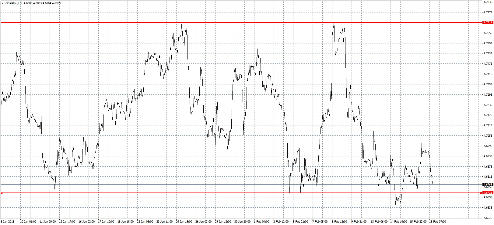 Z czterech opisywanych walut to właśnie frank szwajcarski radził sobie w ostatnim czasie najlepiej względem złotego. Co prawda zeszły tydzień również przyniósł spadek kursu CHFPLN, jednak helwecka waluta cały czas jest relatywnie daleko od lokalnych minimów. Obecnie zmaga się z poziomem 3,60 zł, a kolejne w miarę istotne wsparcie znajduje się trzy grosze niżej. Od góry ruch powinien być ograniczany przez ostatni opór w okolicach 3,65 zł. Brak ważnych odczytów zmniejsza prawdopodobieństwo wybicia, któregoś z ograniczeń, dlatego nie należy oczekiwać większej zmienności w tym tygodniu.