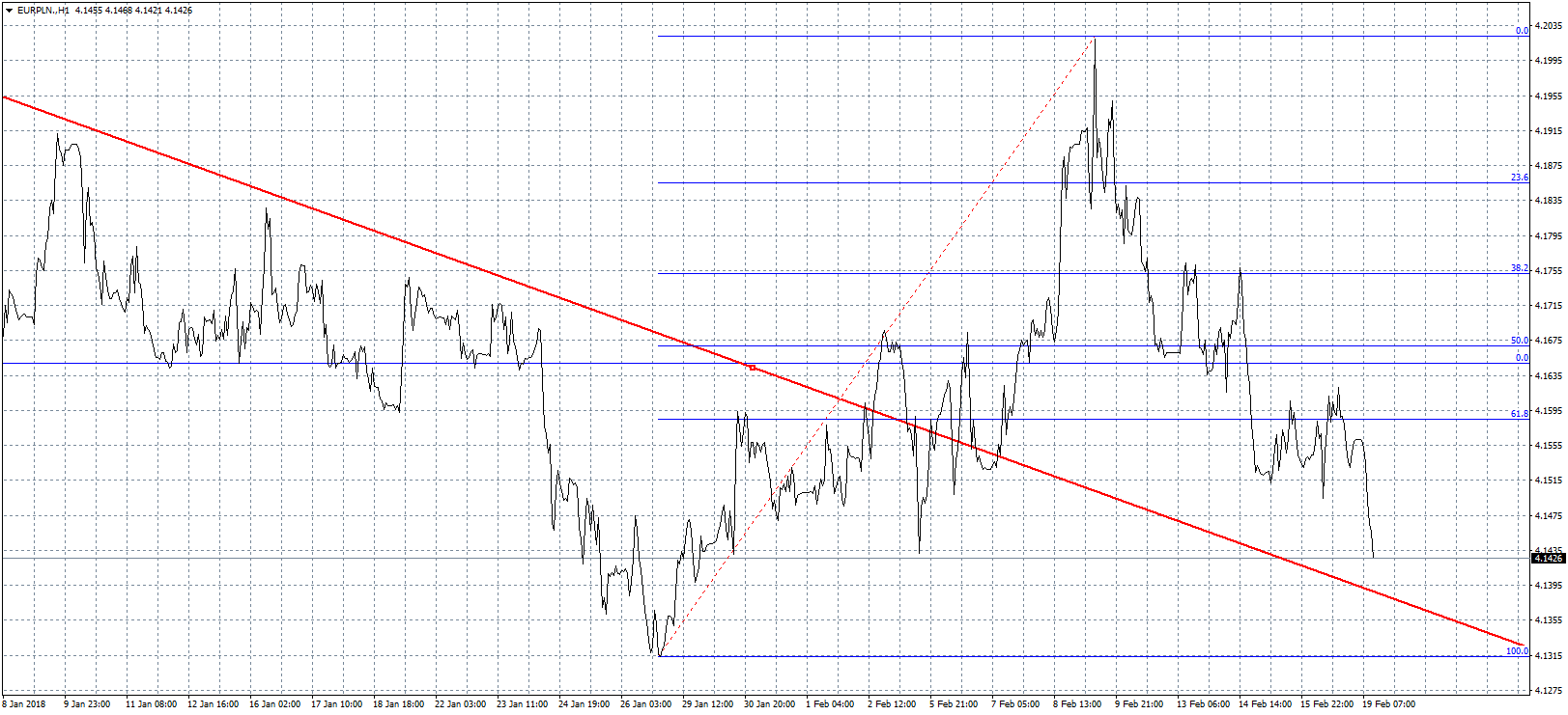 Na przełomie stycznia i lutego euro zanotowało gwałtowny ruch w górę. W krótkim czasie wspólna waluta podrożała o 7 groszy, jednocześnie wyłamując linię trendu spadkowego, zapoczątkowaną jeszcze we wrześniu ubiegłego roku. Euro jednak nie było w stanie pokonać bariery 4,20 zł, przez co poprzedni tydzień należał zdecydowanie do złotego. Kurs EURPLN spadł o 5 groszy, a dzisiaj ruch ten został jeszcze pogłębiony. Najbliższym celem wydaje się być ponowne zejście poniżej wcześniej opisanej linii trendu. Oznaczałoby to jednocześnie atak na poziom 4,10 zł, a tyle euro ostatni raz kosztowało jeszcze w 2014 roku. Będzie to o tyle trudne, że wycena euro cały czas jest wspierana przez ruchy na głównej parze walutowej, choć należy pamiętać, że złoty zawsze lepiej wykorzystywał problemy dolara.