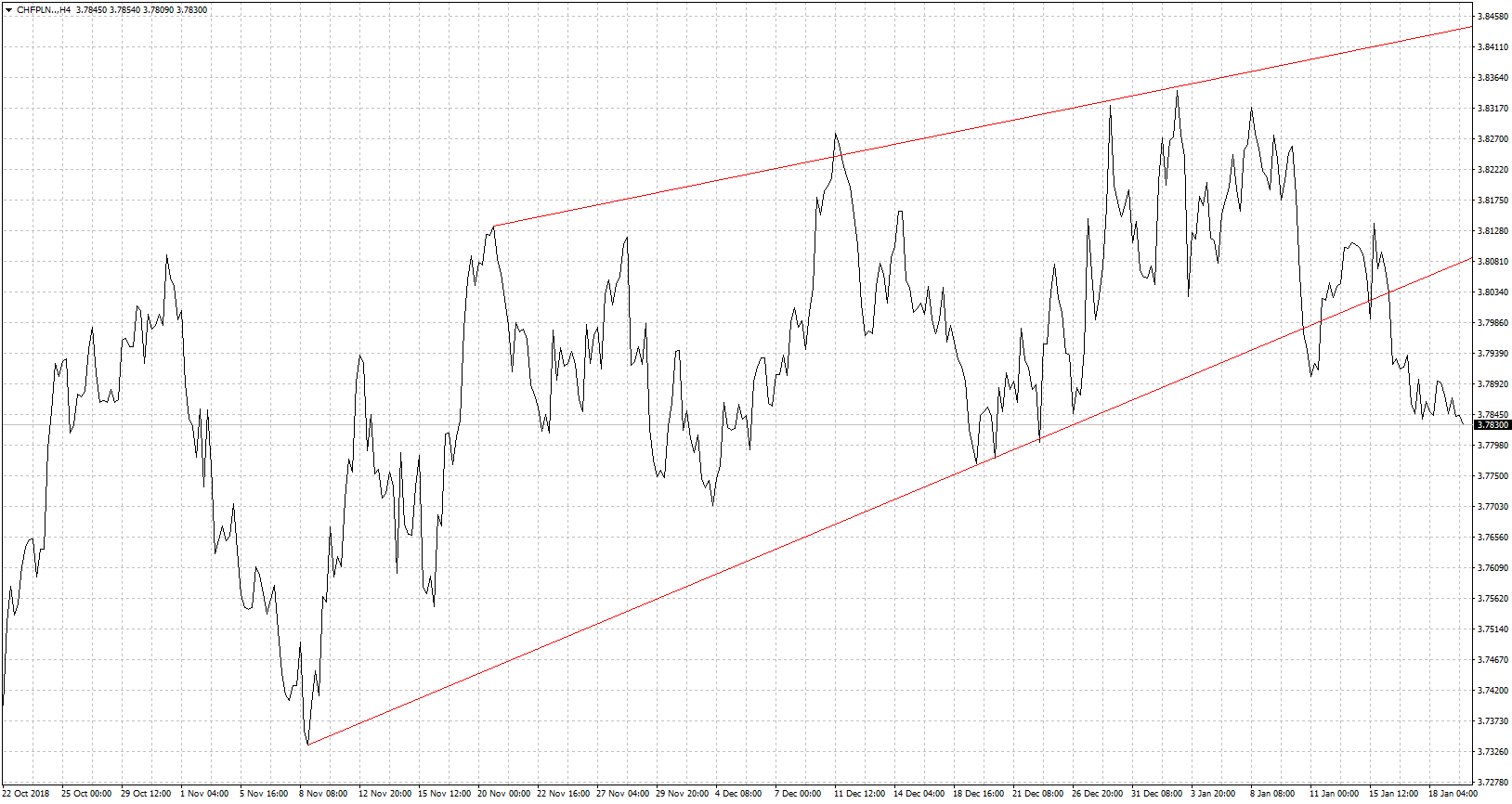 Kurs CHF/PLN przebił wsparcie w postaci dolnego ograniczenia kanału wzrostowego i jest poniżej 3,80. Z jednej strony wynika to z braku nowych informacji w kontekście wojny handlowej USA z Chinami. Z drugiej dzisiejszy wynik PKB z Chin na poziomie 6,6% nie jest aż taki niski co może sugerować, że obawy o światowy wzrost gospodarczy były nieco przesadzone. W efekcie obserwujemy lepsze dni dla walut rynków wschodzących w tym złotego a kapitał odpływa od walut uznawanych za bezpieczne w tym właśnie franka szwajcarskiego. Wiele się wyjaśni również w czwartek jeśli Draghi osłabi wspólną walutę to rykoszetem oberwie CHF/PLN choćby na korelacji z EUR/CHF. Gdzie spadki tej pary wywołują wzrosty na CHF/PLN. Dlatego niewykluczony jest powrót do wyrysowanego kanału wzrostowego. Nie można również zapominać o czynnikach ryzyka takich jak kwestie brexitowe. Co prawda ryzyko twardego wyjścia Wielkiej Brytanii pozostaje małe ale nadal dużo brakuje do wypracowania docelowego scenariusza, który zaakceptują obie strony.