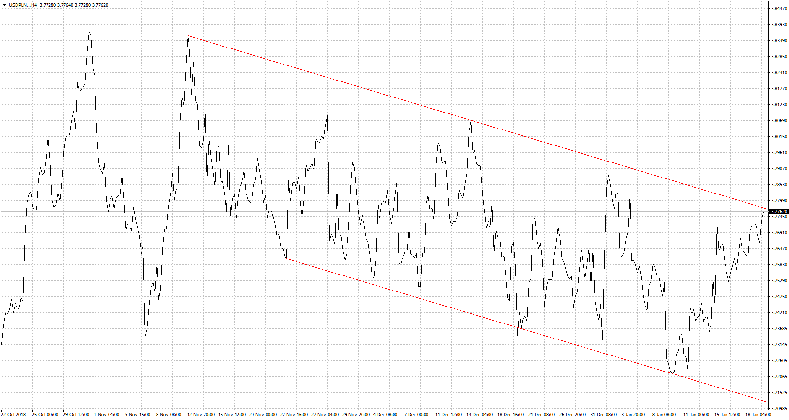 Na USD/PLN nadal obowiązuje kanał spadkowy. Z tym, że kurs zbliża się do oporu w postaci górnego ograniczenia kanału wzrostowego. Jest to efekt ruchu w dół na głównej parze walutowej świata. Tonujące nastroje ze strony przedstawicieli Fed i tym samym scenariusz braku podwyżek stóp w tym roku w USA wywindował EUR/USD na poziomy bliskie 1,15. Ale nie od dzisiaj wiemy, że mocne euro nie leży w gestii EBC więc po kilku dniach i Draghi zareagował mówiąc o konieczności dalszego prowadzenia luźnej polityki bowiem dane ze strefy euro dalej rozczarowują. Stąd szybki odwrót od kupowania euro i spadek w okolice 1,1360. Dla USD/PLN oznaczało to wzrost o prawie 7 groszy. Punktem kulminacyjnym tego tygodnia będzie więc posiedzenie EBC. Jeśli prezes będzie aż nadto gołębi z pewnością zobaczymy test 1,13 na EUR/USD a tym samym USD/PLN znajdzie się znów powyżej 3,80 a być może nawet w okolicach 3,85 ale to w przypadku dużego osłabienia euro względem dolara. Czynnikiem ryzyka dla mocniejszego dolara na pewno pozostaje kwestia blokady działania instytucji rządowych czyli tzw government shutdown. Trump nadal mocno walczy by spełnić swoją obietnicę wyborczą a więc wybudować mur na granicy z Meksykiem.