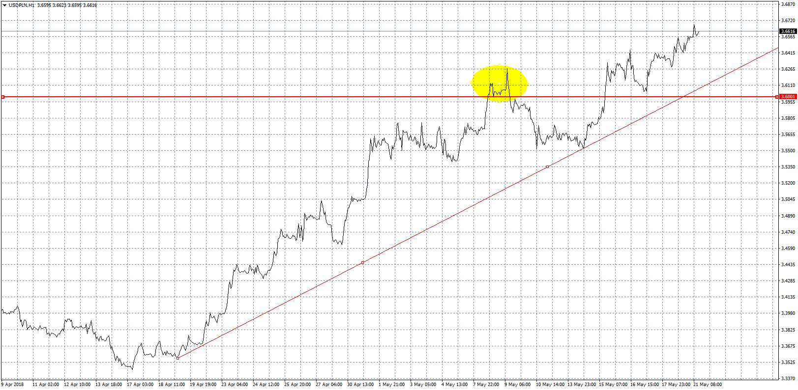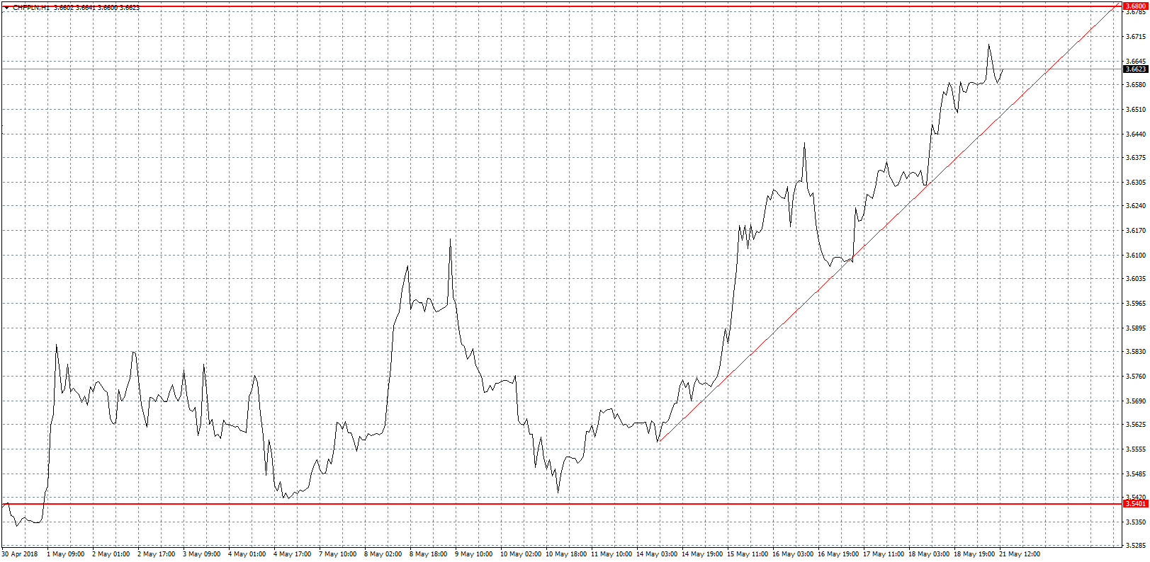 Jeszcze większe ruchy obserwujemy ostatnio na dolarze. Tak naprawdę to on jest odpowiedzialny za ostatnie osłabienie złotego. Silny ruch spadkowy na głównej parze walutowej świata, zwyczajowo już przyniósł osłabienie się walut z koszyka EM (emerging markets). Dodatkowo nastrój wokół tego koszyka psują argentyńskie peso oraz turecka lira, które gwałtownie ostatnio tracą na wartości. W takim otoczeniu złotemu trudno się bronić przed spadkami, zwłaszcza że brakuje impulsu choćby z banku centralnego. Spowodowało to, że dolar zdecydowanie przebił poziom 3,60 zł i bez przerwy kieruje się na północ. Na początku maja można było mieć jeszcze nadzieje na zakończenie złej passy złotego zwłaszcza ze względu na wcześniejszy nieudany atak na ten opór. Po nim dolar potaniał do 3,55 zł. Ostatni tydzień jednak już zdecydowanie należał do amerykańskiej waluty, dlatego dzisiaj dolar jest już 12 groszy droższy.