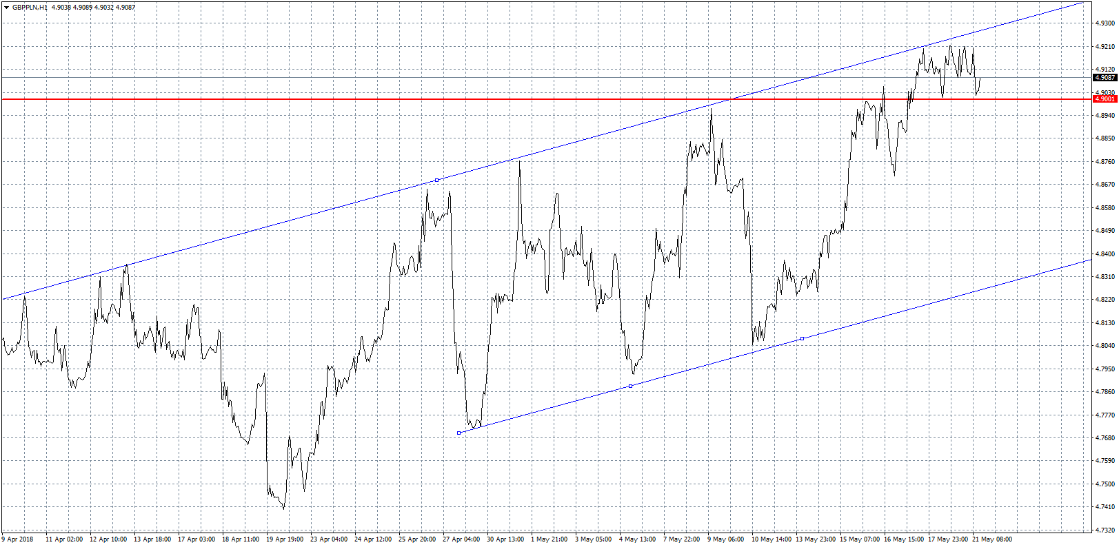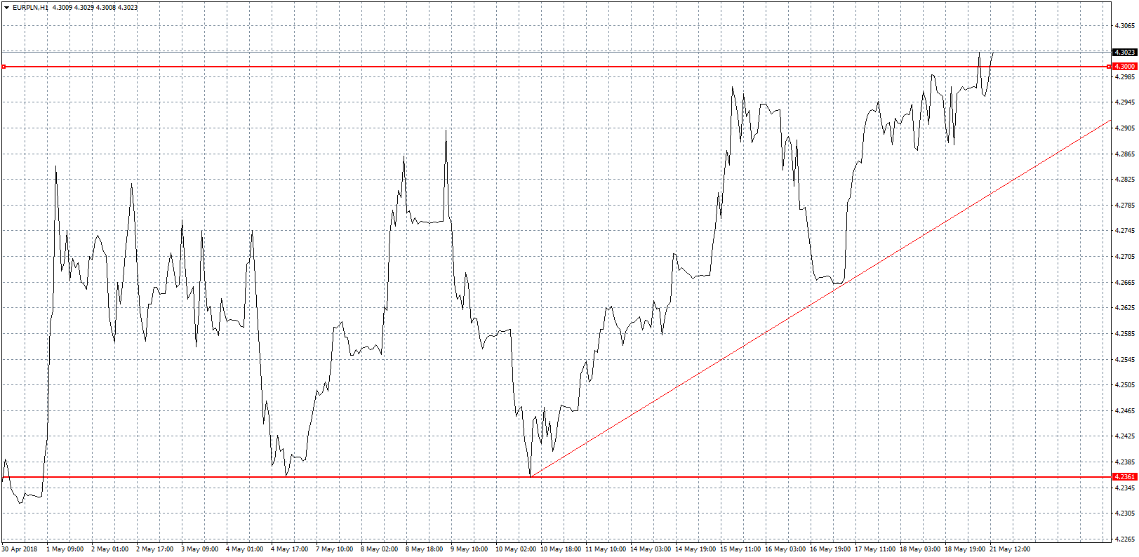 Euro jeszcze na początku maja dwukrotnie próbowało pokonać wsparcie na poziomie 4,236 zł. Obie próby okazały się nieudane i od prawie dwóch tygodni wspólna waluta systematycznie drożeje. Efektem tego jest dzisiejszy atak na 4,30 zł, który prawdopodobnie zakończy się trwałym złamaniem tej bariery. Ostatni raz euro kosztowało aż tyle w październiku zeszłego roku, kiedy to udało się tylko na chwilę pokonać tę barierę. Jeśli obecny ruch się nie zatrzyma EUR/PLN, wróci na poziomy ostatnio widziane na przełomie 2016 i 2017 roku. Warto pamiętać, że jeszcze na początku kwietnia euro było o 15 groszy tańsze, więc dynamika ruchu jest wyjątkowo duża. Prędzej czy później zapewne będziemy obserwować jakiś ruch korekcyjny, co nie zmienia faktu, że obecny trend spokojnie może sięgnąć co najmniej 4,35 zł.