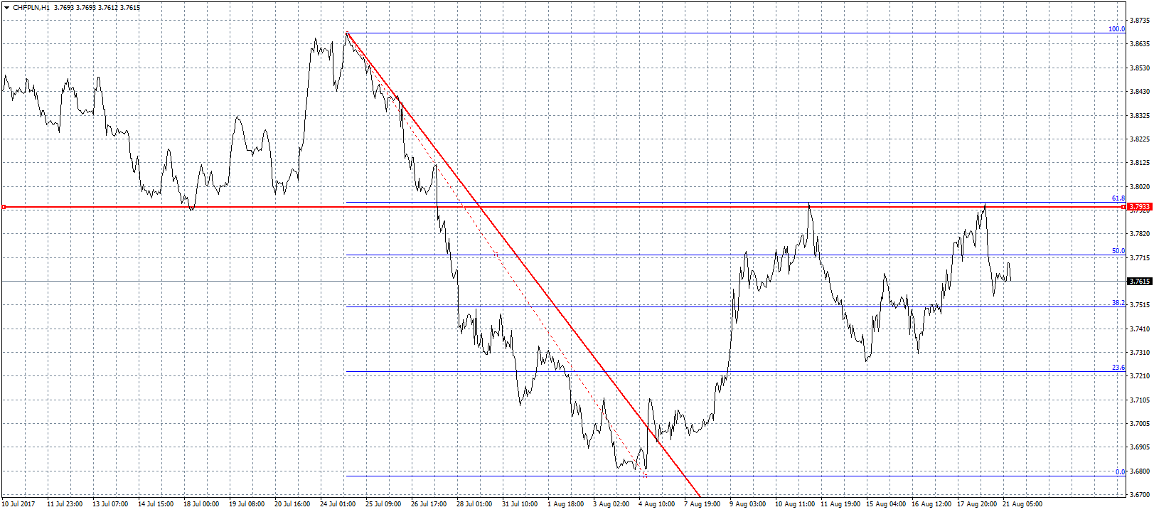 Frank powoli odzyskuje siły, po tym, jak na przełomie lipca i sierpnia jego kurs względem złotego (i nie tylko) gwałtownie się załamał. W przeciągu dwóch tygodni szwajcarska waluta potaniała o blisko 20 groszy. Tempo spadków przyspieszyło po pokonaniu wsparcia na poziomie 3,80 zł, by na początku sierpnia kosztować zaledwie 3,68 zł. Jest to najniższy poziom od pamiętnego frankmagedonu z 15 stycznia 2015 roku. Później jednak kurs CHFPLN zaliczył mocną korektę, znosząc blisko dwie trzecie ruchu spadkowego. Oporem okazał się wspomniany wcześniej poziom 3,80 zł, który przez 2,5 roku był skutecznym wsparciem. W ostatnim tygodniu w tych okolicach zarysowała się formacja podwójnego szczytu, co tylko potwierdza, że powrót powyżej 3,80 zł, będzie co najmniej trudny. Z punktu widzenia analizy technicznej często tak się zdarza, że wcześniejsze wsparcie po pokonaniu zamienia się w opór.