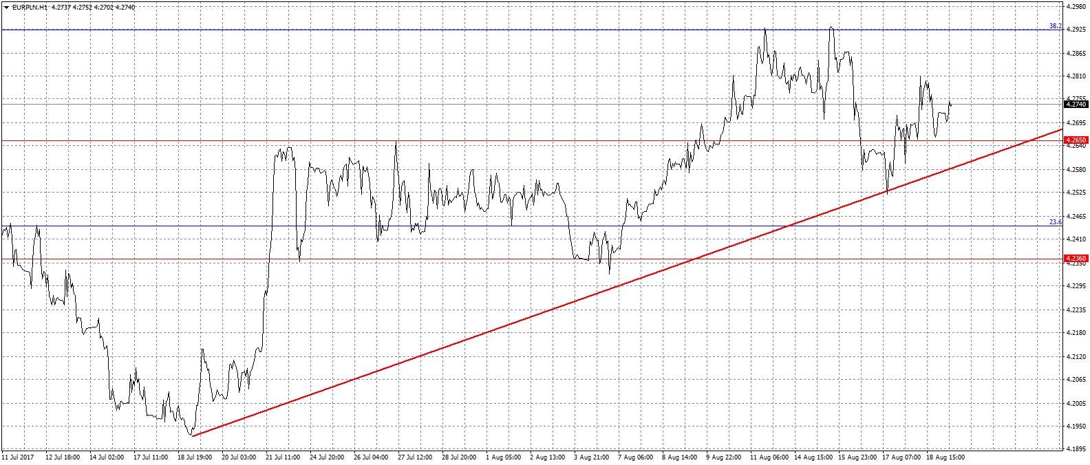 Euro po tym, jak kolejny raz próbowało sforsować barierę 4,20 zł w połowie lipca, rozpoczęło ruch w górę. Nieudany atak poskutkował dynamicznym umocnieniem wspólnej waluty względem złotego. Kilkadziesiąt godzin później kurs doszedł do poziomu 4,265 zł, po czym przeszedł w okres konsolidacji o zasięgu 3 groszy. Względny spokój panował do 9 sierpnia, kiedy to euro przebiło górne ograniczenie konsolidacji. Zabrakło jednak impetu, by testować poziom 4,30 zł, zwłaszcza że “po drodze” ważnym oporem okazało się zniesienie fibo. W okolicach 4,29 zł, wypada 38,2% ruchu głównego tegorocznego trendu. Względna bliskość dwóch istotnych oporów (fibo oraz okrągły poziom) może na pewien czas zatrzymać umocnienie wspólnej waluty. Należy jednak pamiętać, że od dołu zbliża się linia bieżącego trendu, co oznacza, że kurs nie będzie mógł za długo trwać w zawieszeniu i najpóźniej w przyszłym tygodniu wyłamie, któreś ograniczenie. Wyjście górą prawdopodobnie będzie oznaczało powrót do poziomów ostatni raz widzianych w marcu.