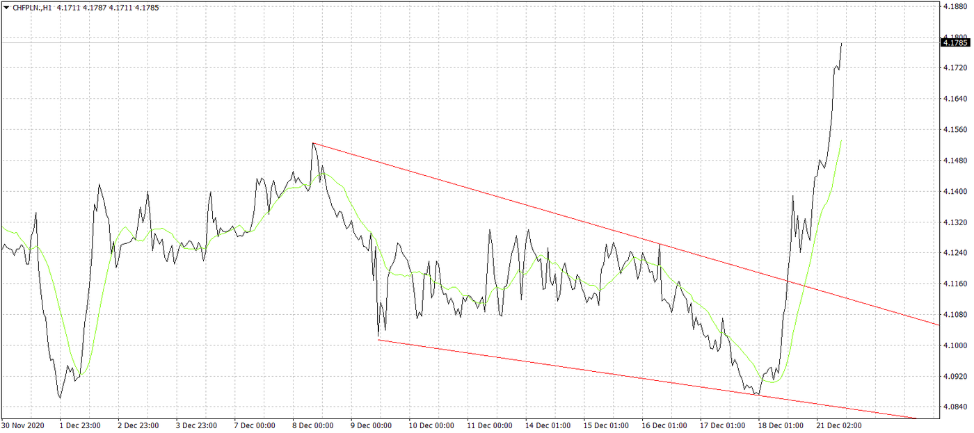 Nieoczekiwana decyzja NBP ma swoje odzwierciedlenie także na parze CHF/PLN. Kurs jest już wyżej o prawie 10 groszy niż jeszcze raptem kilka dni temu. Osłabienie spowodowane interwencją to jedno, ale od początku tygodnia rynki startują w ponurych nastrojach, co tylko potęguje ten ruch. Powodem pesymizmu na rynku jest nowy szczep koronawirusa wykryty w Wielkiej Brytanii. Ponoć o wiele bardziej zaraźliwy, co przekładając na reakcję inwestorów, może oznaczać, że boją się wybuchu nowej fali zachorowań i tym samym jeszcze ostrzejszych restrykcji. Gracze rynkowi chętnie inwestują w bezpieczną przystań, jaką jest frank, też z powodu kolejnego fiaska rozmów Wielkiej Brytanii z UE, co może się przełożyć na twardy brexit. Technicznie para CHF/PLN najbliższy opór ma dopiero na poziomie 4,20. Pytanie, jak rząd będzie chciał załatwić sprawę kredytobiorców frankowych, którzy znów płacą wyższe raty kredytów wskutek tych wyżej wymienionych czynników. Walka o ożywienie gospodarcze to jedno, ale drugą stroną medalu jest właśnie ta grupa osób, która ponosi w takich sytuacjach większe obciążenia.