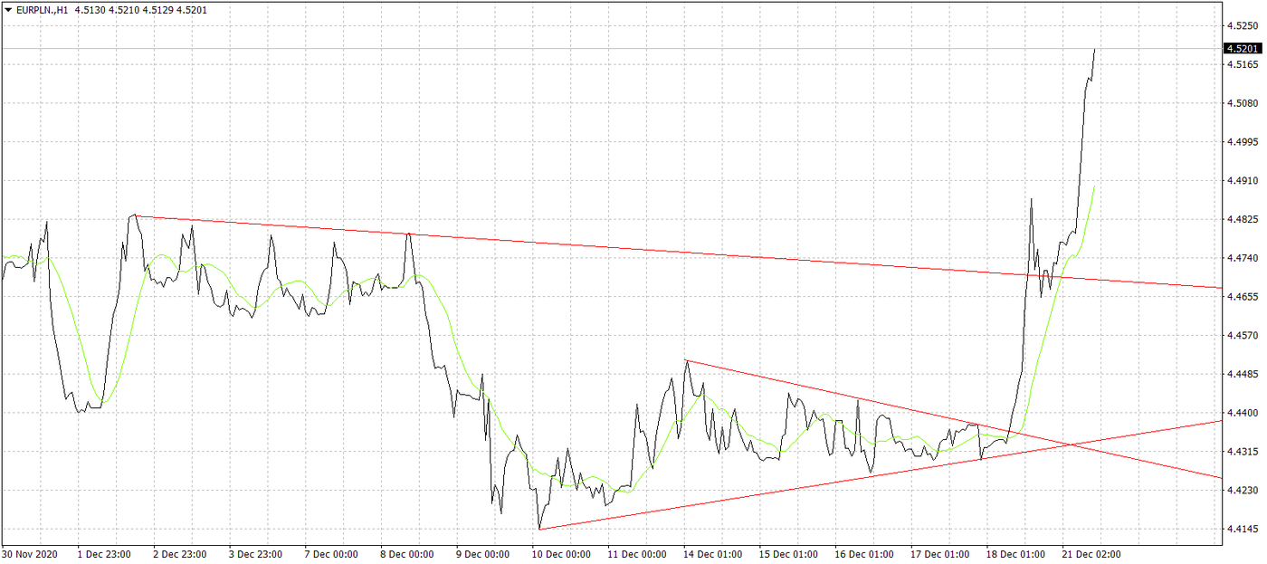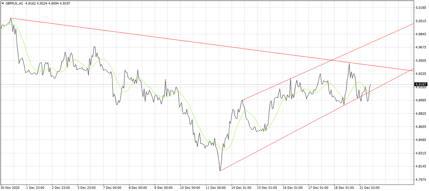 Na GBP/PLN aż tak mocnego trendu wzrostowego, jak na pozostałych wyżej opisywanych parach nie widać. Powód jest jeden, a mianowicie słabość funta na szerokim rynku. Nowy szczep wirusa może spowodować dużo większe restrykcje na Wyspach, niż ma to miejsce w tej chwili, co przełoży się na gospodarkę. Z drugiej strony saga brexitowa cały czas się ciągnie i nie widać jej końca. Za 10 dni Wyspiarze wyjdą z UE bez żadnej umowy i nie zanosi się, by takowa nagle została dogadana. Głównym spornym aspektem pozostaje kwestia łowisk. Co by nie mówić, wbrew pozorom na całej tej zwłoce Wielka Brytania może zyskać. Stanie się tak, jeśli jeszcze przez kilka miesięcy będzie miała dostęp do jednolitego rynku, bo żadne ustalenia nie wejdą w życie od 1 stycznia, a Unia sama nie będzie chciała odczuwać konsekwencji twardego brexitu. Nie wykluczone więc, że choćby do końca roku jakiś większy rajd funta zobaczymy. Psychologicznym oporem dla dalszych wzrostów pary GBP/PLN będzie 5,00.