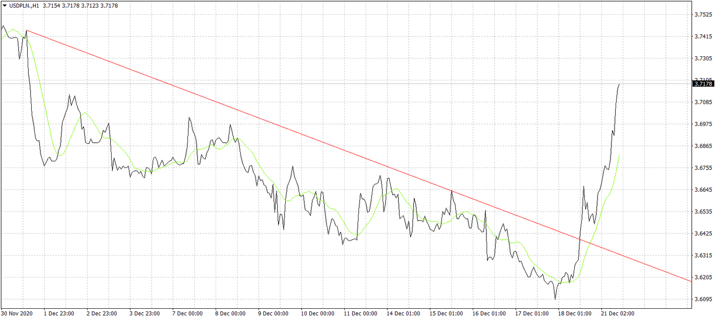 USD/PLN tylko dzisiaj zyskuje już 1,5%. Interwencja NBP jest więc widoczna i na tej parze. Tutaj też można się dziwić, czemu akurat w tym przypadku niskie notowania miałyby niepokoić decydentów, skoro rekompensują one wzrost cen surowców takich jak np. ropa. Patrząc globalnie na dolara, to widać dzisiaj odzyskiwanie przez niego blasku, ale jak długo możemy je dostrzegać, to okaże się w najbliższych dniach. Jest to związane z tematem, o którym pisaliśmy powyżej, a więc z nowym szczepem koronawirusa. Inwestorzy szybko zapomnieli o dobrych informacjach z USA, czyli porozumieniu w sprawie pakietu fiskalnego, którego negocjacje zajęły ponad 6 miesięcy. Pomoc w kwocie 900 mld USD udało się jednak w końcu dopiąć i każdy Amerykanin otrzyma 600 USD jednorazowej wypłaty (abstrahując od sensowności akurat takiego działania). W teorii więc powinniśmy zobaczyć giełdy na plusach i słabego dolara, ale tak się nie dzieje. Teraz trwają kalkulacje rynkowe, jak newsy z Wysp wpłyną na gospodarki. W stabilizacji nie będzie pomagał przeplatany świętami, rwany handel w ostatnich dniach tego roku, który może spowodować, że bezpieczne przystanie pozostaną w cenie i tym samym USD będzie mocny. Najbliższy opór na USD/PLN znajduje się na poziomie 3,75.