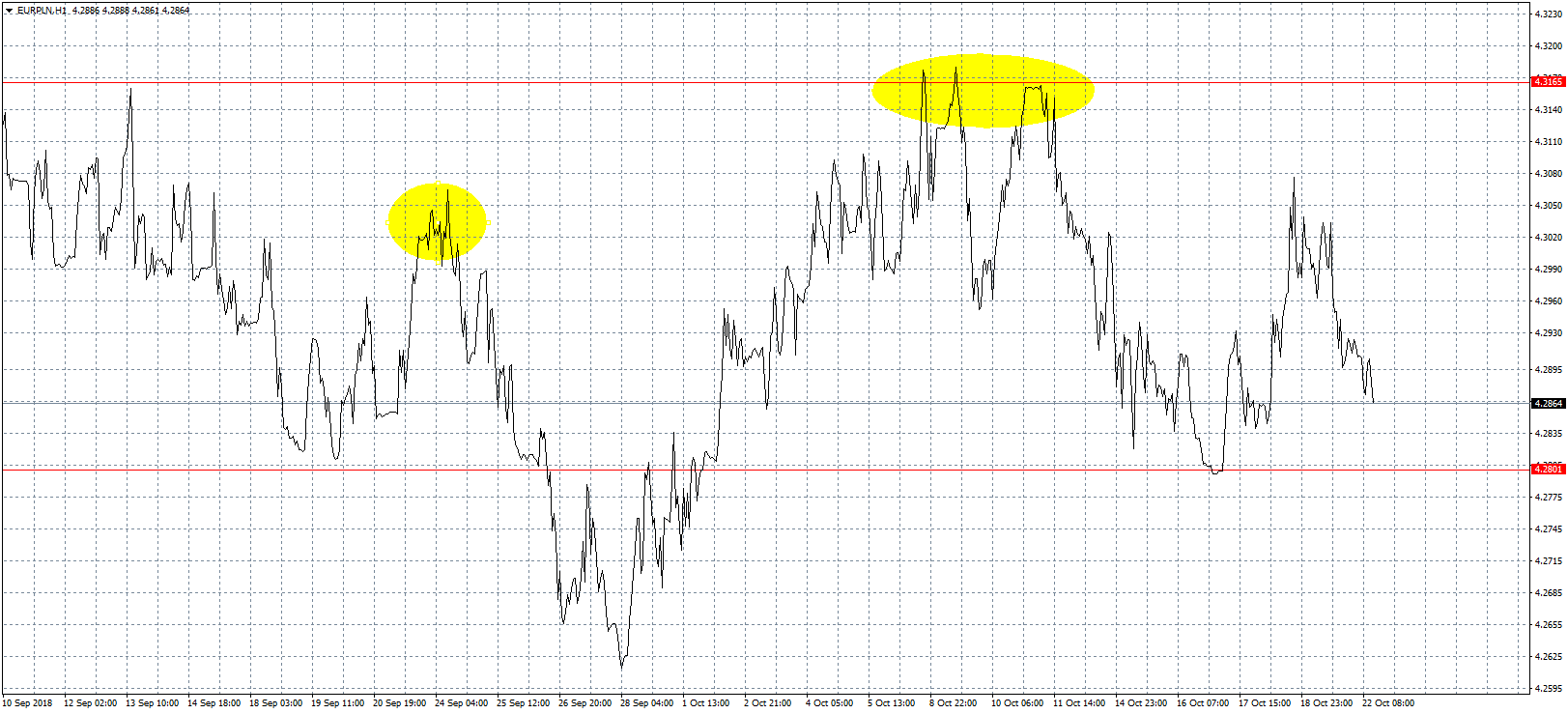 Tabela. Maksima i minima głównych walut w PLN. Zakres: 15.10.2018-22.10.2018