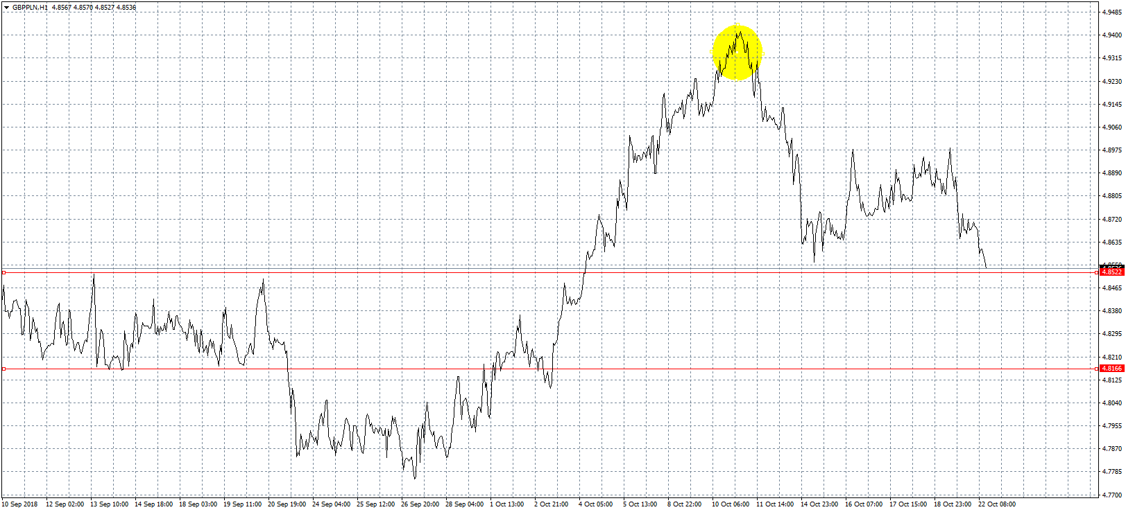 Funt cały czas pozostaje pod presją brexitowych domysłów. Doprowadziły one brytyjską walutę do poziomu 4,85 zł, który najpierw był oporem, by później odegrać rolę wsparcia. Zadziałało ono w połowie miesiąca, wstrzymując na pewien czas przecenę funta. Dzisiaj jednak poziom ten został złamany, co prawdopodobnie było reakcją na słowa Theresy May w brytyjskim parlamencie. Obecna pani premier ma coraz słabszą pozycję, a widmo “no deal” brexit staje się coraz bardziej wyraźne. Po przełamaniu wyżej opisanego wsparcia kurs GBP/PLN bez przeszkód powinien dotrzeć do poziomu 4,80 zł, który wcześniej wielokrotnie był w stanie zawrócić kurs. Tym razem jednak wydaje się, że polityka jest znacznie silniejsza od analizy technicznej i to na nią rynek będzie zwracał szczególnie baczną uwagę.