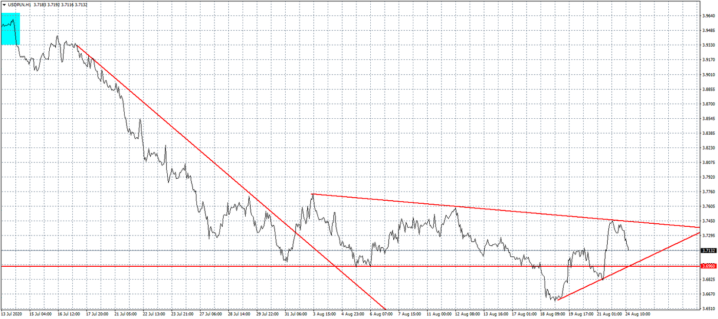 Podobny scenariusz obserwujemy na dolarze. Zeszły tydzień przyniósł przełamanie linii wsparcia przy 3,695 zł. Później jednak z kolejnymi dniami “zielony” skutecznie odrabiał straty, zarysowując nawet mały trend wzrostowy. Wpisuje się on w szerszą formację klina, który jeszcze w tym tygodniu powinien zostać wybity. Wyjście górą prawdopodobnie zakończy się sięgnięciem po wakacyjne szczyty. Wybicie dołem sprokuruje kolejną próbę zawiązania trendu spadkowego. W tym tygodniu ma się odbyć konferencja w Jackson Hole, która zawsze wzbudza wiele emocji. Jak zwykle jednym z mówców będzie szef Rezerwy Federalnej i jego słowa mogą rozruszać notowania dolara. Warto pamiętać, że ostatnimi czasy FED konsekwentnie rozczarowuje rynki swoimi wypowiedziami i niewiele wskazuje, by w tym tygodniu miało się to zmienić.