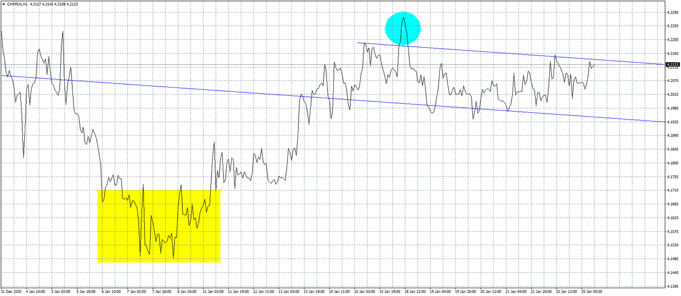 Wykres kursu franka do złotego, interwał 1-godzinowy