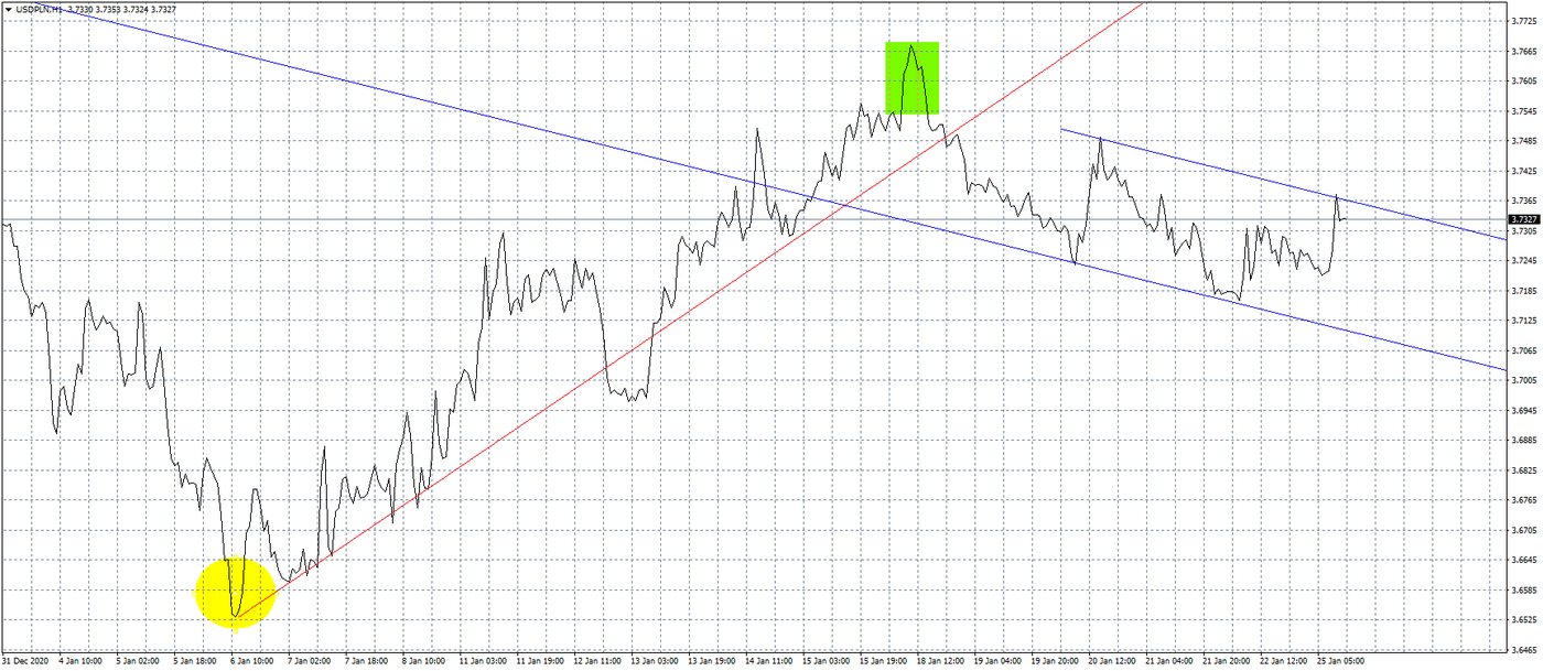 Wykres kursu dolara do złotego, interwał 1-godzinowy