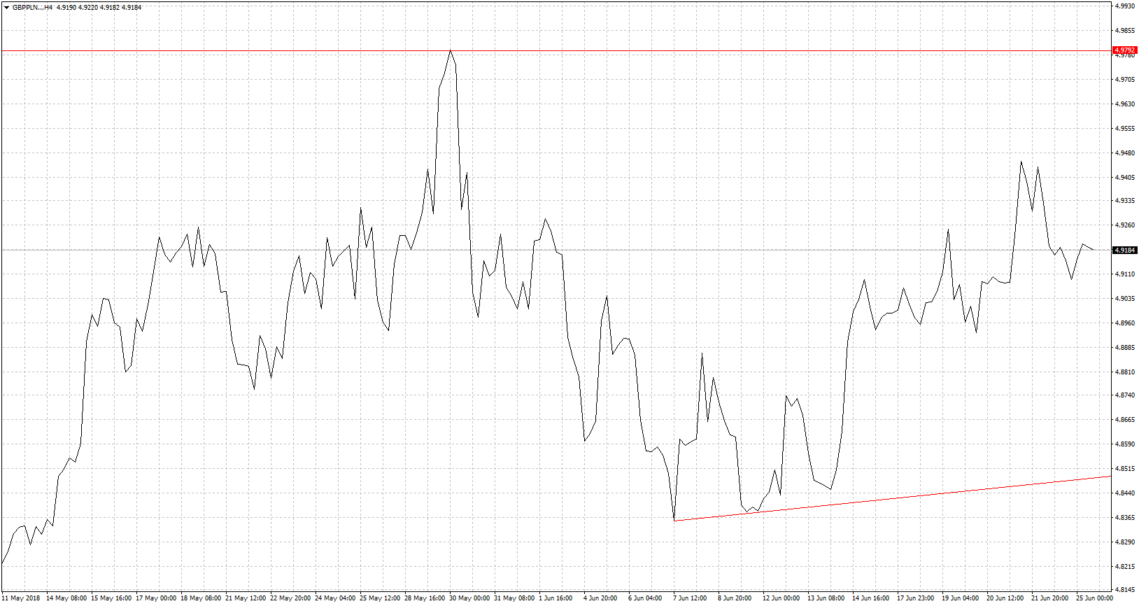 Również na CHF/PLN doskonale widać aktualne podejście inwestorów. Lokują oni swoje środki w bezpieczne przystanie stąd wynika umocnienie franka szwajcarskiego. Waluta Szwajcarii nie jest odosobniona i rosną w siłę także inne waluty uznawane za bezpieczne czyli jen i dolar amerykański. Jest to jak najbardziej uzasadnione podejście biorąc pod uwagę to co się dzieje na świecie. Z jednej strony to do niemal znudzenia temat wojny handlowej USA z praktycznie całym światem. Ostatnie informacje mówią o zablokowaniu chińskich inwestycji w amerykański sektor technologiczny. Z drugiej strony pojawiają się niepokojące informacje z Niemiec o utarczkach wewnątrz koalicji rządzącej. Merkel ma ponoć dwa tygodnie na rozwiązanie sprawy uchodźców. W przeciwnym wypadku SPD widzi nawet możliwość powołania nowych wyborów nawet we wrześniu. Póki co rynki biorą to za dość utopijny scenariusz ale gdyby się tak stało możemy oczekiwać silnej wyprzedaży euro a co za tym idzie umocnienia franka szwajcarskiego. I po trzecie temat Turcji. Erdogan po niedzielnych wyborach zyskał niemal pełnię władzy. Teoretycznie źle ale w praktyce może się okazać, że będzie to wsparciem dla mocno przecenionej liry bo przynajmniej na chwilę zniknie niepewność. Tym samym umocnienie jednej z walut krajów wschodzących mogło by być na plus dla innych, a tym samym dla złotego. Oporem dla dalszych wzrostów będzie sforsowanie ostatniego maksimum.