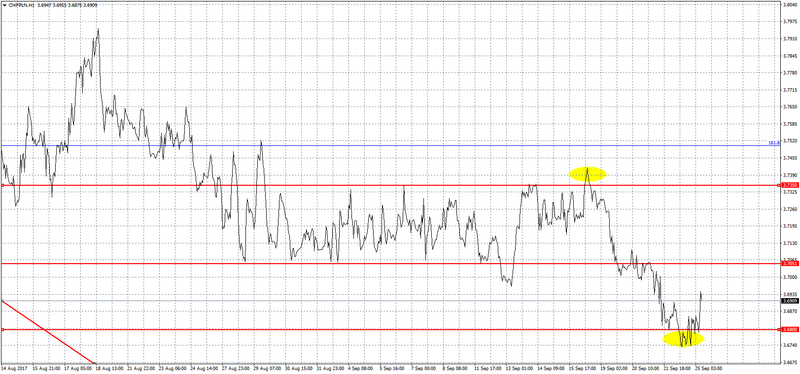Dużo ciekawego ostatnio wydarzyło się na wykresie CHFPLN. Pod koniec sierpnia frank wszedł w wąską trzygroszową konsolidację, z której dwukrotnie nieskutecznie próbował się wybić. Najpierw 12 września dołem oraz niecały tydzień później górą. Oba ruchy zostały szybko zanegowane i dopiero zeszłotygodniowy atak na dolne ograniczenie okazał się skuteczny. Po przełamaniu i szybkim reteście kurs spadł w okolice tegorocznego minimum. Udało się nawet chwilowo zejść poniżej 3,68 zł, jednak poziom ten ostatecznie został wybroniony. Cały czas znajdujemy się jednak poniżej 3,70 zł, a to oznacza, że w najbliższym czasie są możliwe kolejne próby zejścia niżej. Warto zauważyć, że od początku roku frank potaniał już blisko o 30 groszy.